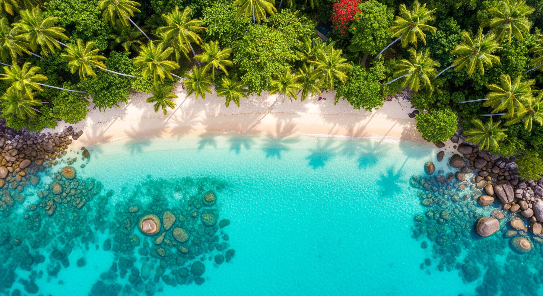 Escape to paradise with this breathtaking aerial view. Imagine the soft sands and crystal-clear waters gracing your walls. This vibrant design showcases lush palm trees and captivating turquoise hues. The pattern adds depth and a touch of the tropics, ideal for creating a relaxing atmosphere. Use this wallpaper for walls to transform your living room, bedroom, or even bathroom into a serene getaway. The calming colors and natural elements create a stylish, inviting space that enhances any interior.