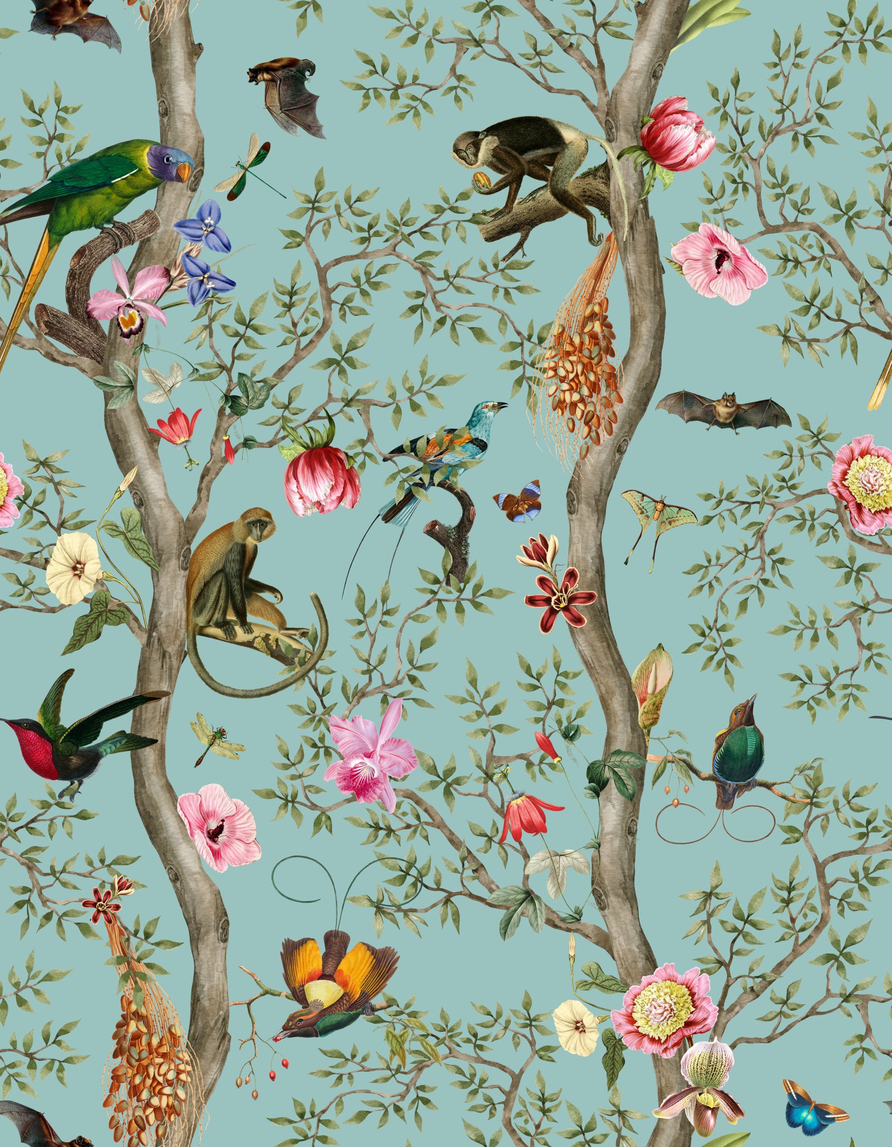 Undslippe til et 'tropisk paradisfugle' med dette livlige tapet. Designet viser en fantastisk række eksotiske fugle, der ligger blandt frodige løv og livlige blomster. Fra kolibrier til papegøjer er hver fugl afbildet med udsøgte detaljer, hvilket skaber en fængslende scene med tropisk liv. Den beroligende teal -baggrund supplerer de dristige farver på flora og fauna og giver en luft af ro til den livlige sammensætning. Perfekt til at tilføje et strejf af eksotisk skønhed og elegance til ethvert rum, dette tapet fremkalder følelser af varme, afslapning og flugt.