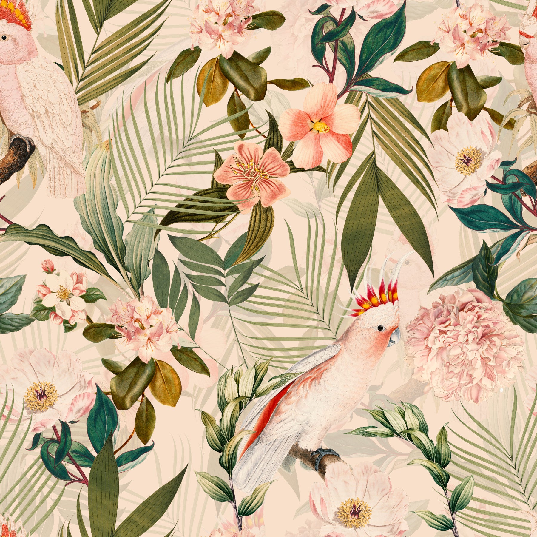Dyber dig selv i et pulserende tropisk paradis med dette udsøgte tapet. Intrikate akvarelillustrationer af lyserøde og hvide cockatoos aborre midt i et frodigt landskab af eksotiske blomster. Delikate lyserøde pioner, livlige hibiscus og frodige palmer skaber en harmonisk blanding af farve og struktur. Den bløde beige baggrund forbedrer den samlede rolige og romantiske atmosfære, hvilket gør den perfekt til at tilføje et strejf af elegant natur til ethvert rum. Dette tapet fremkalder en følelse af rolig og ro og transporterer dig til en rolig oase.
