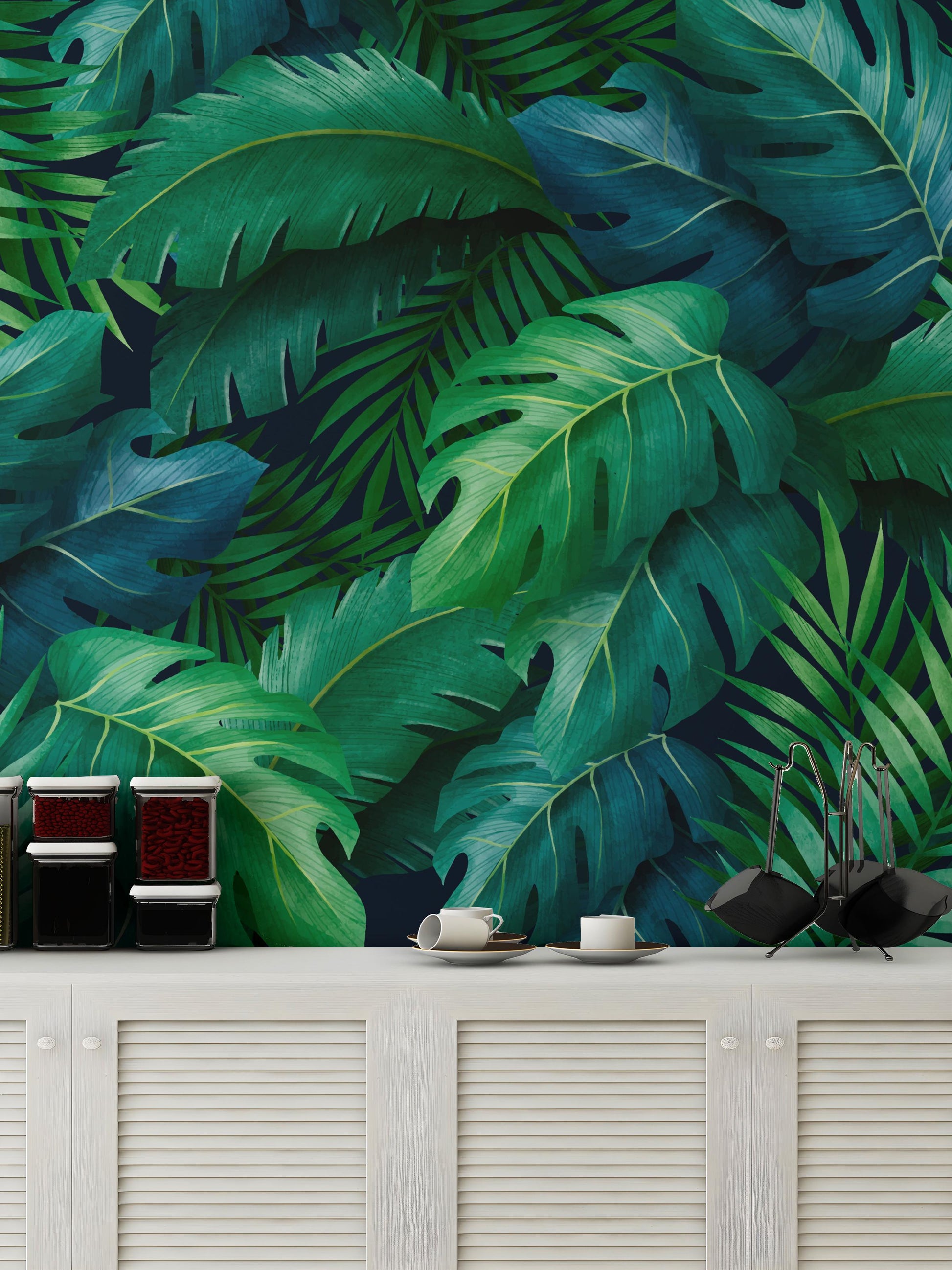 Large tropical leaves wallpaper for a vibrant wall statement.