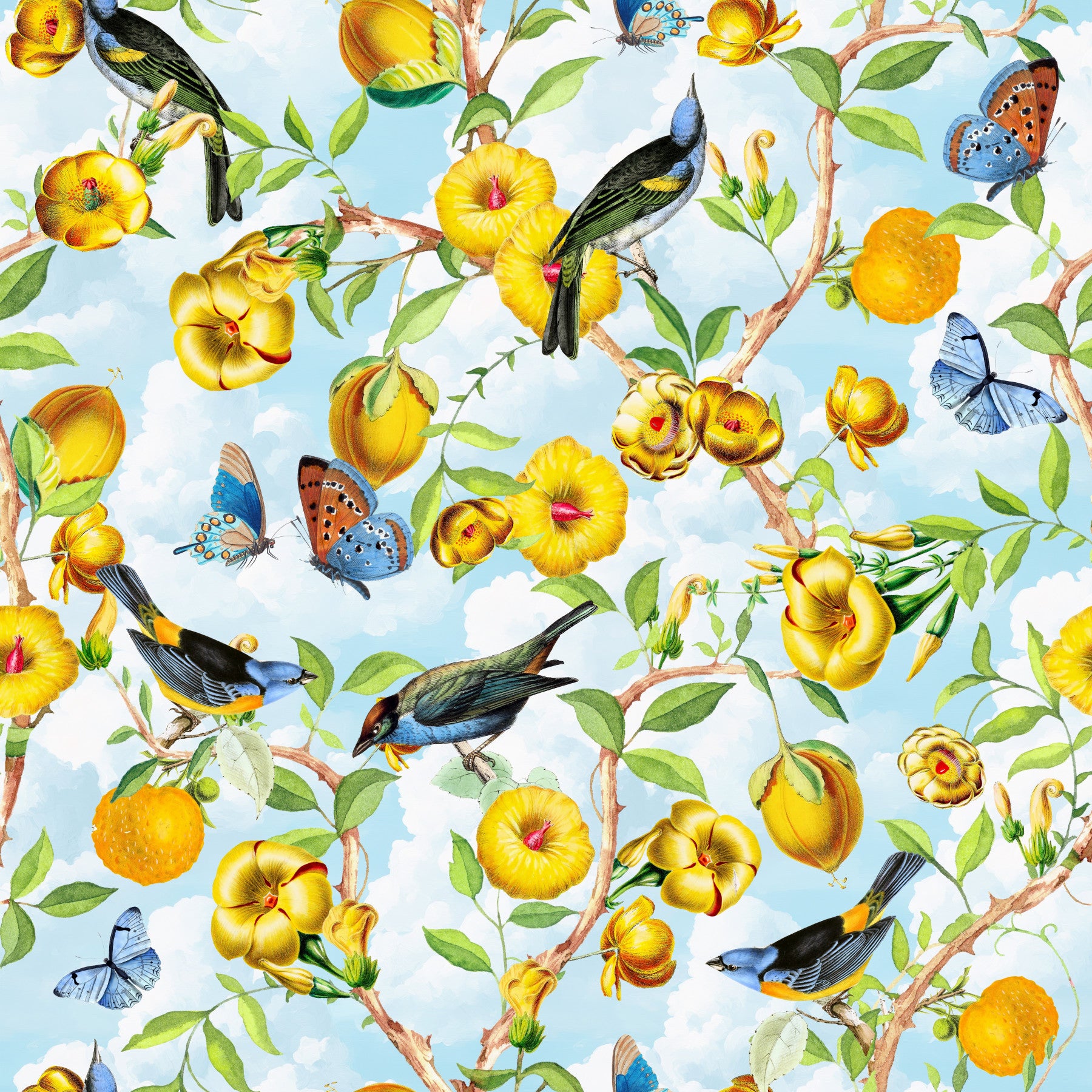 Undslippe til et pulserende tropisk paradis med dette fantastiske tapet. Rige gule blomster brast frem, sammenflettet med frodigt grønt løv og skaber en livlig og energisk scene. Farverige fugle aborre yndefuldt midt i blomsterne og tilføjer et strejf af eksotisk charme. Vandfarvestilen tilføjer en blød, delikat kvalitet til de dristige farver, perfekt afbalancerende vibration og sindsro. Bring tropens varme og skønhed ind i dit hjem med dette fængslende design.