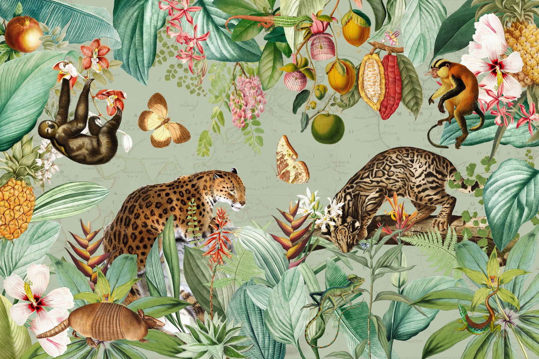 Gå på en fængslende visuel rejse med "tropisk vintage ekspedition." Dette fantastiske tapet transporterer dig til en frodig, levende regnskov, gengivet i en klassisk vintage stil. Intrikate botaniske illustrationer af eksotiske blomster, frugter som kakao bælg og ananas og et vintage kort baggrund skaber en atmosfære af videnskabelig efterforskning og opdagelse. Storslåede dyreliv, inklusive jaguarer, dovendyr, aber og armadillos, er problemfrit integreret i denne detaljerede komposition, der tilbyder en unik og fortryllende blanding af naturens skønhed og lokkemåden af ​​tidligere ekspeditioner. Den rige farvepalet og omhyggelige detaljer fremkalder en følelse af forundring og eventyr, perfekt til at tilføje et strejf af eksotisk elegance til ethvert rum.
