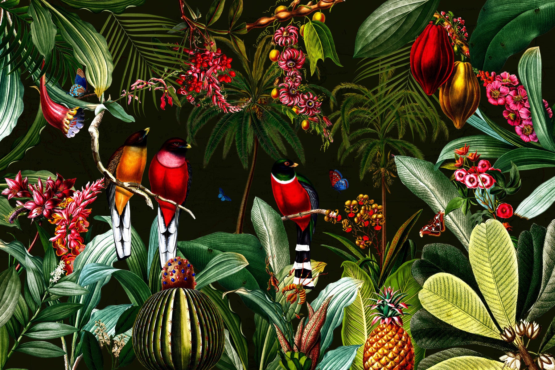 Vintage tropical mural wallpaper with vibrant colors and foliage.