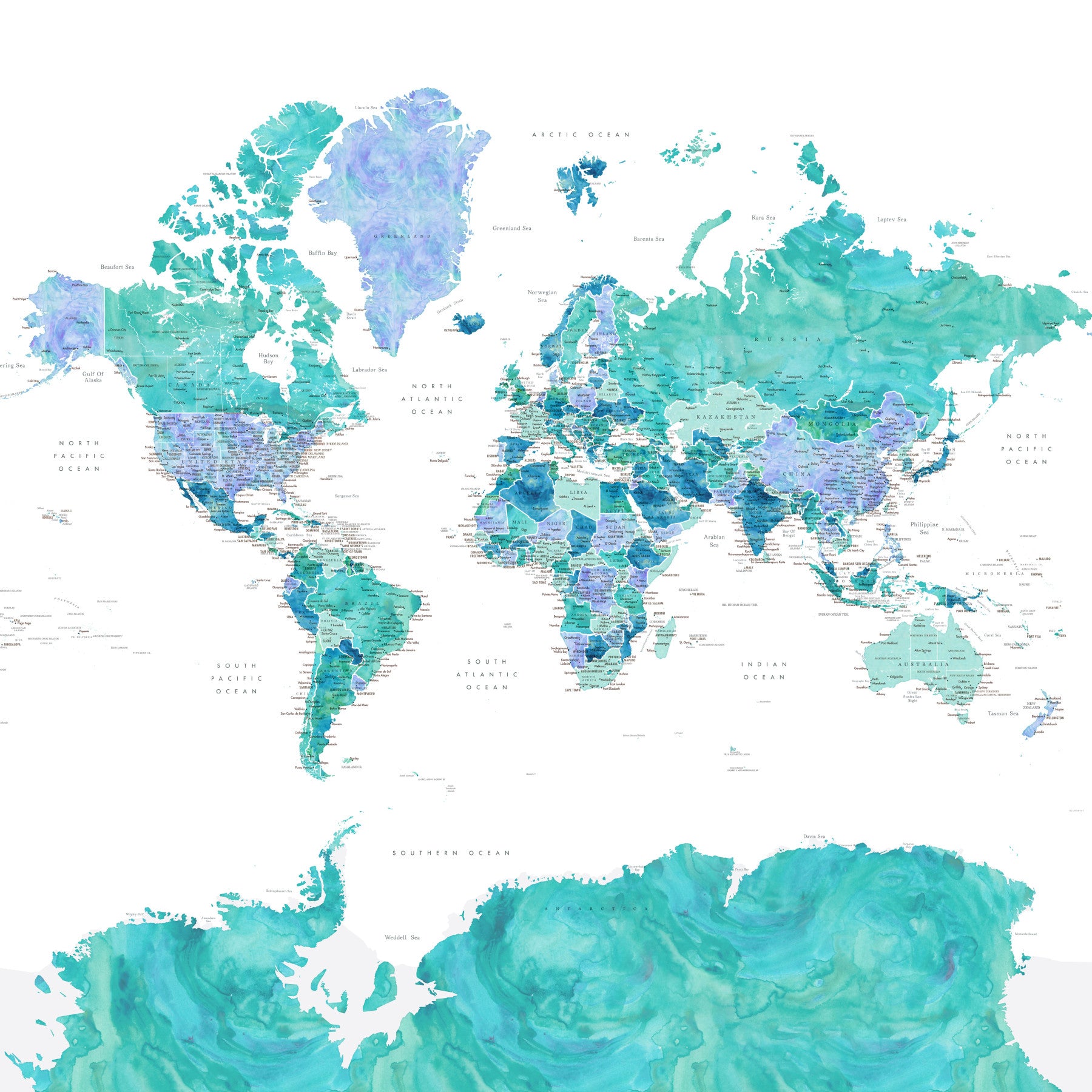 Tilføj en stænk af farve og kreativitet til dine vægge med det turkis akvarel verdenskort tapet. Med livlige nuancer af turkis, aqua og teal i et flydende akvareldesign bringer dette kort både kunstnerisk skønhed og global charme til ethvert rum. Med klart mærkede lande og byer fungerer det som både et dekorativt og uddannelsesmæssigt stykke. Ideel til stuer, studieområder, børnenes rum eller interiør med rejsetema, parrer det perfekt med moderne og kystindretning. Fås i skræl-og-stick eller traditionelle tapetmuligheder, det er let at installere og fremstillet med miljøvenlige materialer. Udforsk verden i farve og stil.