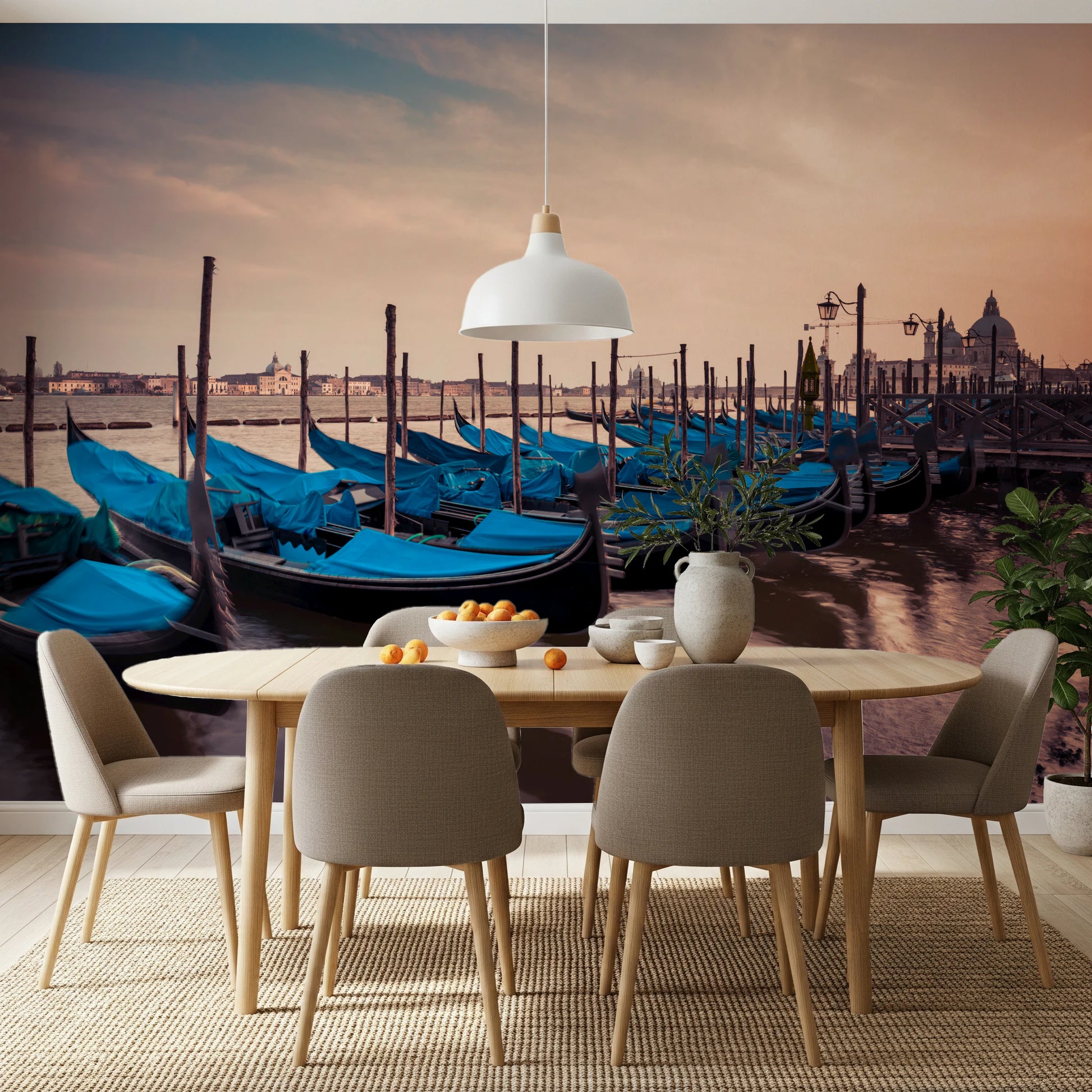 Mooring area for Gondolas on the grand canal, Venice, Italy. Elevate your interior with this stunning wallpaper for walls, featuring the iconic gondolas of Venice in a mesmerizing twilight scene. The image evokes a sense of calm and tranquility, with the gondolas resting quietly on the water. The design employs a sophisticated blend of deep blues, soft browns, and dusky pinks, adding a touch of elegance to any room. This wallpaper suits living rooms, bedrooms, or even a refined home library. Its calming presence creates an inviting atmosphere, perfectly complementing contemporary and classic interior styles. Experience Venetian charm daily.