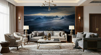 Transform your interiors with this evocative image. Hazy mountains rise in the distance, softened by a dreamlike mist. The palette features deep blues, soft yellows, and shades of gray, lending a calm feel. Install this wallpaper for walls in your bedroom, study, or even the hallway to build an atmosphere. This scene supports minimalism, modern and serene decor. It adds a touch of nature to indoor spaces.