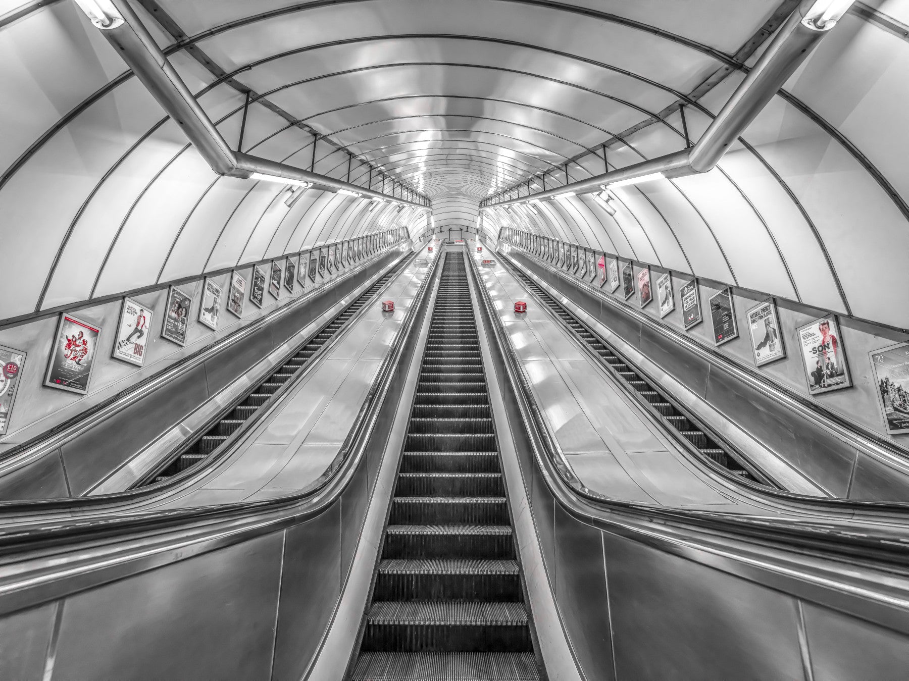Rulletrappe på Subway Station, London. Transform din plads med denne overbevisende gråtonercale tapet. Den har et symmetrisk billede af metro -rulletrapper, der trækker øjet til et forsvindende punkt. Det monokromatiske skema får et stød fra strategisk placerede røde elementer og tilføjer et unikt fokuspunkt. Dette tapet til vægge passer til moderne indretning, der giver et urban touch til ethvert rum. Placer den i en stue for at skabe en sofistikeret stemning, eller brug den på et hjemmekontor til at inspirere kreativitet. Designets rene linjer parrer let med flere interiørstilarter.