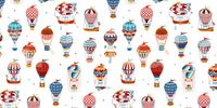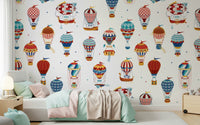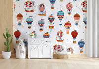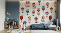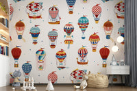 Let your imagination soar with this playful hot air balloon pattern! The whimsical design features colorful balloons in a variety of styles, perfect for adding a touch of adventure to any room. It blends reds, blues, and yellows on a clean white backdrop. This wallpaper for walls makes a great choice for kids' rooms, playrooms, or anywhere you want to create a cheerful and uplifting atmosphere. It complements vintage and modern interiors.