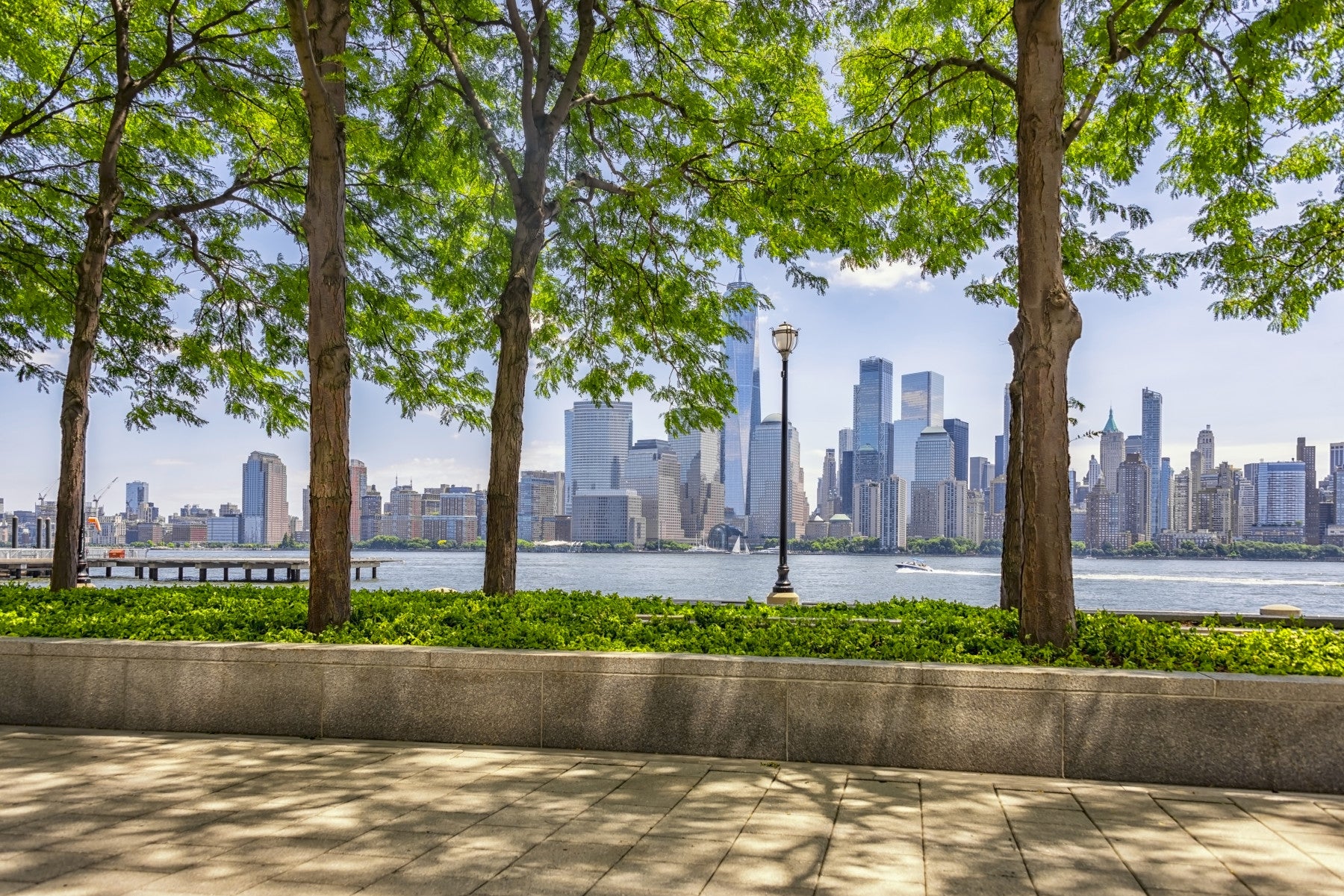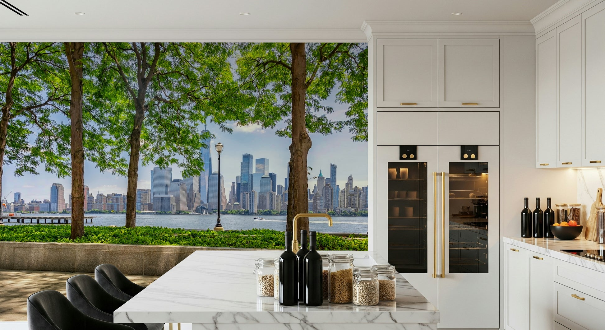 Bring a slice of serene cityscape into your home with this unique wallpaper for walls. It captures a view of the city skyline framed by lush greenery. The design presents a cool palette of greens, blues, and grays that fosters calm. It introduces a sense of nature within urban interiors. Picture this design brightening a modern living room or adding depth to a home office. The photograph suits a variety of spaces where you want to cultivate relaxation or add a nature-inspired scene.