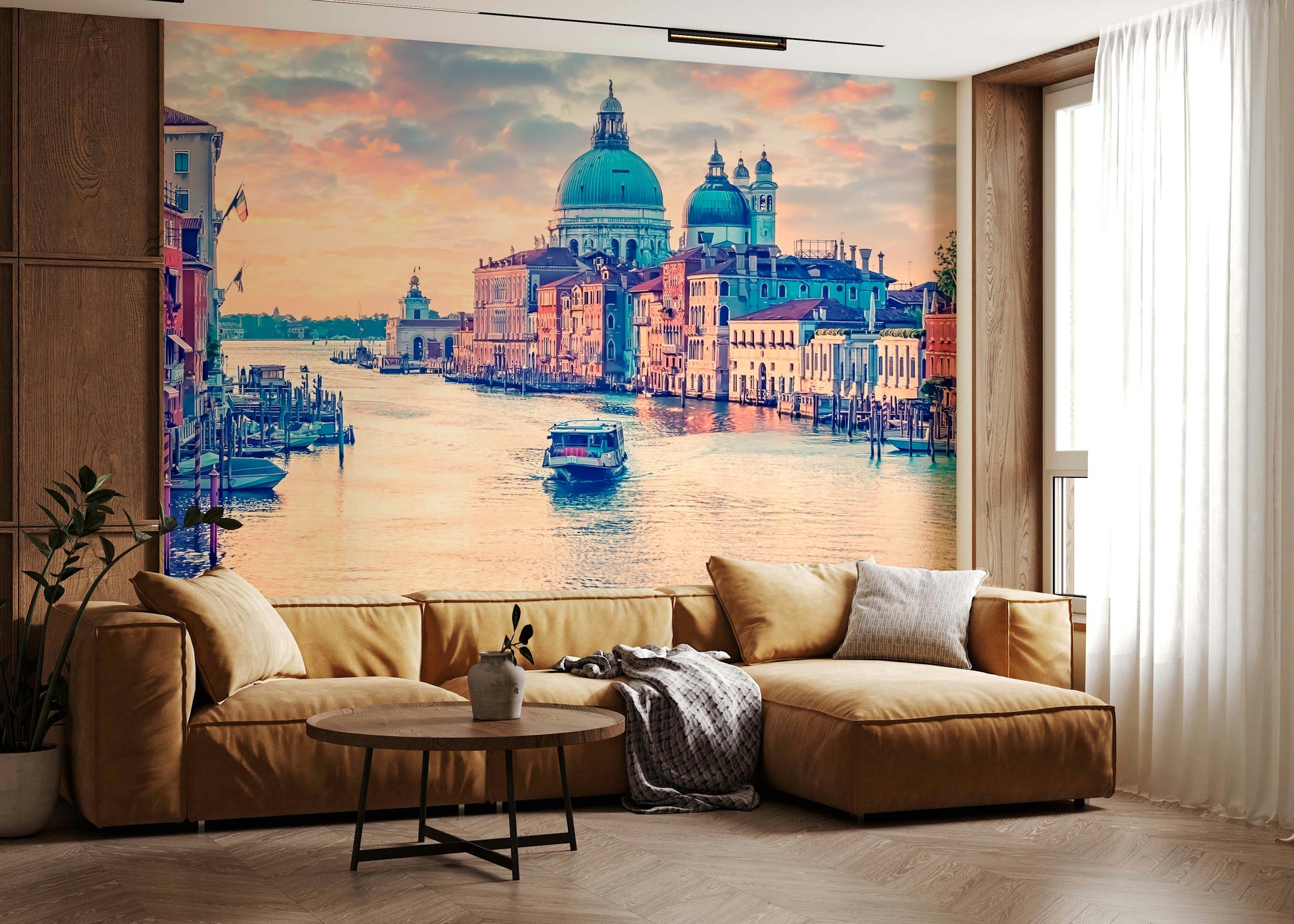 Transform your space with this stunning wallpaper for walls featuring a picturesque view of Venice. The design showcases the Grand Canal flanked by historic buildings and a serene waterway. The color palette of soft blues, pinks, and oranges evokes a tranquil sunrise, creating a peaceful atmosphere in any room. This wallpaper adds a touch of elegance and sophistication, perfect for a living room, bedroom, or dining area. Its detailed architectural elements complement both modern and classic interiors, enhancing the depth and character of your walls. Infuse your home with the timeless beauty of Venice.