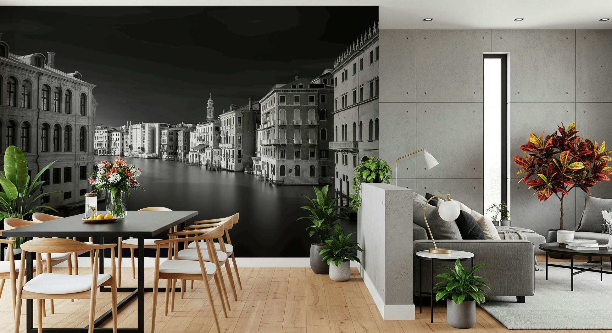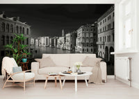 This wallpaper for walls presents a captivating monochrome view of Venice. The image captures the city's timeless beauty, featuring its historic buildings and serene waterways. The elegant grayscale palette complements various interiors, from modern minimalist spaces to classic studies. Bring a touch of Italian charm and sophistication to your living room, bedroom, or office with this striking design. Its neutral tones create a calm atmosphere.