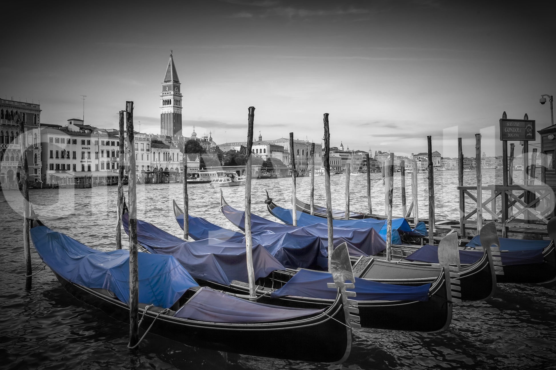 Step into a timeless scene of Venice, where the iconic St Mark's Campanile pierces the sky in the distance. This evocative wallpaper captures the essence of the Grand Canal, with a fleet of gondolas gently bobbing in the water, their blue covers adding a splash of color to the otherwise muted palette. The weathered wooden posts stand as silent witnesses to the city's rich history and romantic allure. Immerse yourself in the serene atmosphere of this classic Venetian vista, a perfect reminder of the city's unique charm and enduring beauty.