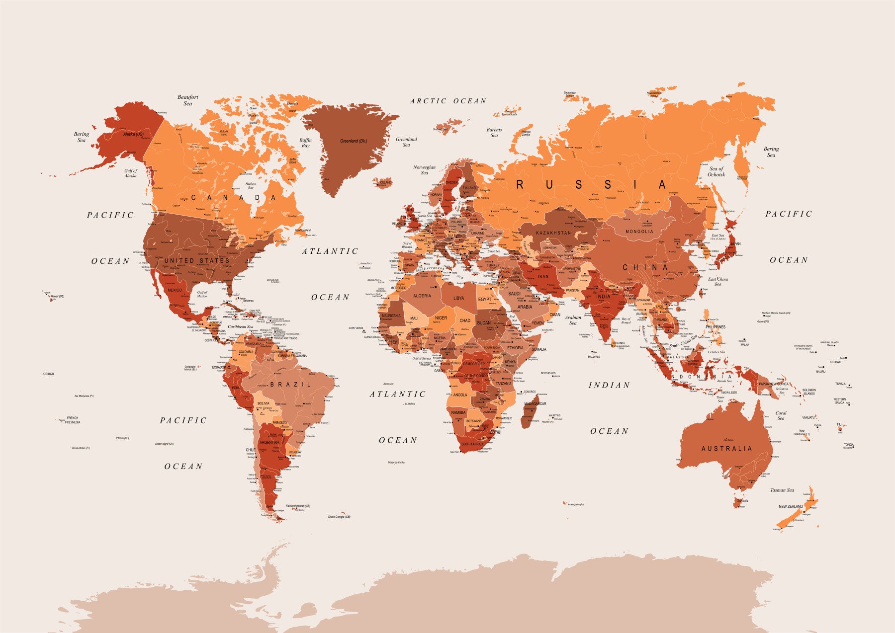 Tag på en visuel rejse over hele kloden med vores World Map Burnt Orange tapet. Dette slående design præsenterer et detaljeret verdenskort gengivet i varme, jordagtige toner af brændt orange, hvilket skaber en vintage, men moderne æstetik. De rige nuancer fremkalder følelser af udforskning, eventyr og kartografiens tidløse skønhed. Designet beskriver omhyggeligt lande, byer og geografiske træk, alt gengivet i forskellige nuancer af orange for at skabe dybde og visuel interesse. Perfekt til at tilføje et strejf af rejselyst og raffinement til ethvert rum, er dette tapet ideelt til drømmere, rejsende og alle, der værdsætter unikt og kunstnerisk design. Forvandl dit rum til et globalt paradis med tapetet "World Map Burnt Orange", et vidnesbyrd om vores verdens skønhed og opdagelseslysten.