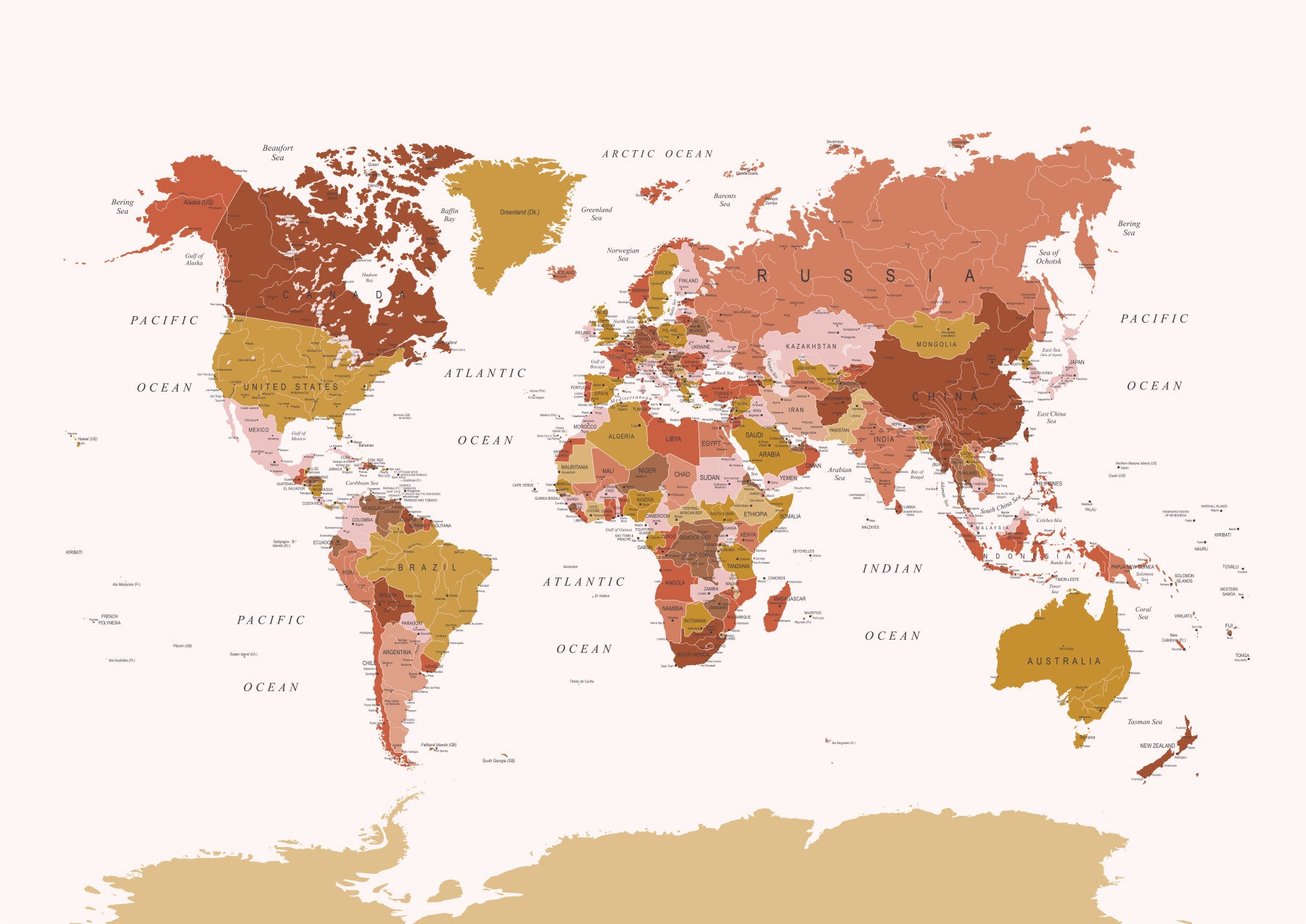 Gå på en visuel rejse over hele kloden med dette detaljerede verdenskort tapet. Dette tapet er gengivet i en sofistikeret palet af jordfarver, fra terracotta til beige og tilbyder et varmt og indbydende æstetisk til ethvert rum. Kortet skitserer omhyggeligt lande, hav og større byer, hvilket gør det både visuelt forbløffende og uddannelsesmæssigt. Det er et ideelt valg for et hjemmekontor, studie eller stue, der giver et strejf af vandrende og intellektuel nysgerrighed over for din interiørindretning. Udforsk skønheden i vores planet fra komforten i dit hjem.