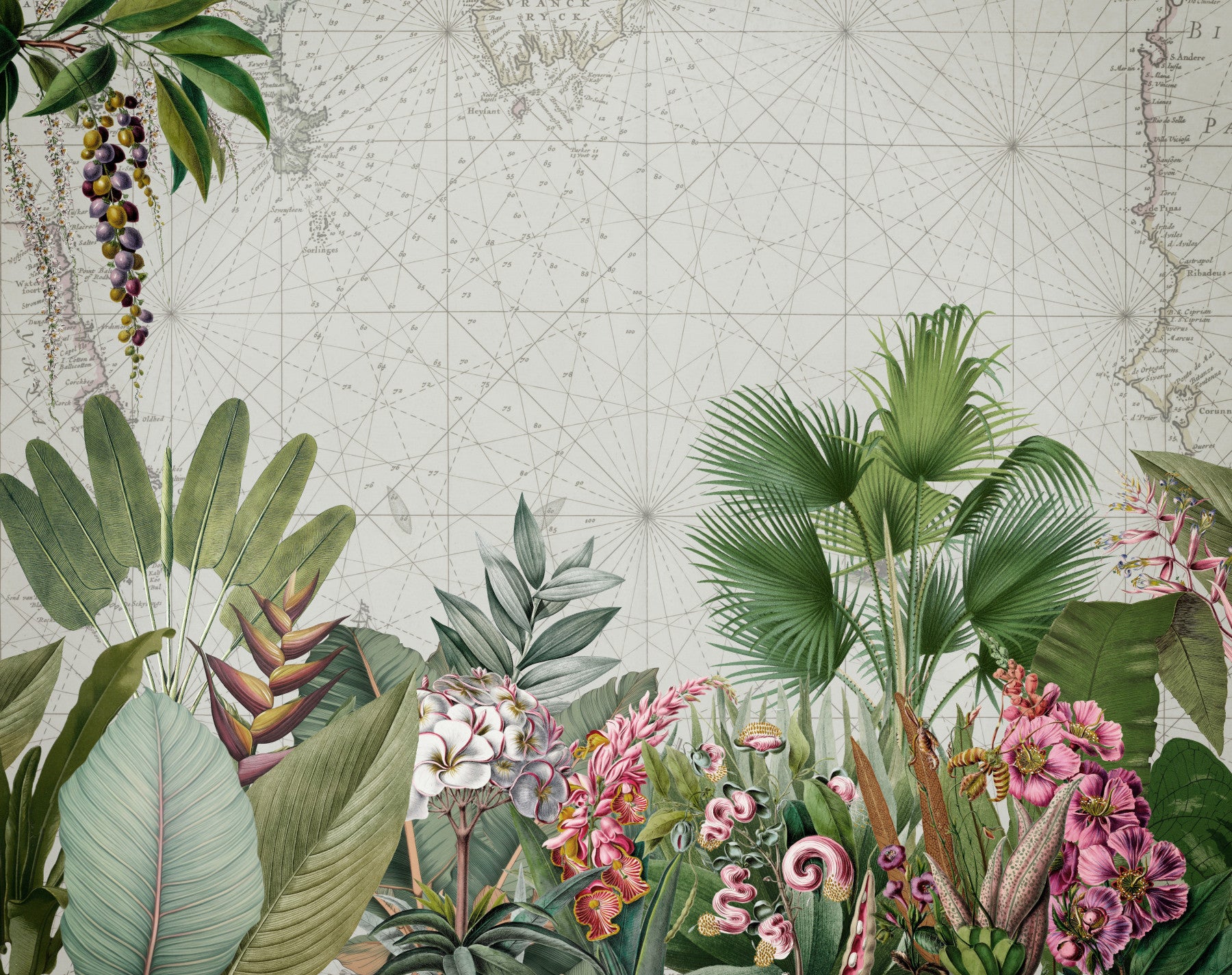 Gå på en visuel rejse med dette fængslende tapet. Intrikate botaniske illustrationer af frodig tropisk flora og fauna er kunstigt arrangeret på baggrund af et antikt nautisk diagram. Den detaljerede håndtegnede stil fremkalder en følelse af eventyr og udforskning, der blander naturens skønhed med søfaringens historie. Grønne, pink og beige toner skaber en rolig, men alligevel levende atmosfære, perfekt til at tilføje et strejf af eksotisk charme til ethvert rum. Dette tapet er et vidnesbyrd om den vedvarende lokkemåde af botanisk kunst og opdagelsesånden.