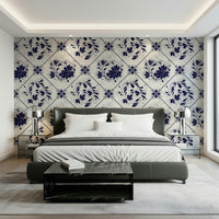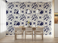 Embrace the timeless allure of vintage design with our "Vintage Indigo Floral Tiles." This stunning wall décor evokes the charm of handcrafted artistry, reminiscent of traditional ceramic tiles. The repeating pattern features delicate floral motifs in a rich indigo hue, artfully presented on an aged, slightly textured backdrop. The indigo designs pop against the light, off-white background, creating an intriguing visual contrast that is both calming and sophisticated. These beautifully rendered floral accents, interspersed with vintage distressing, add depth and character to any room, creating a stylish focal point. Transform your space into a haven of understated elegance with this classic and refined wall covering, bringing a touch of old-world grace to modern interiors. It captures the essence of time-worn beauty and breathes new life into your walls.