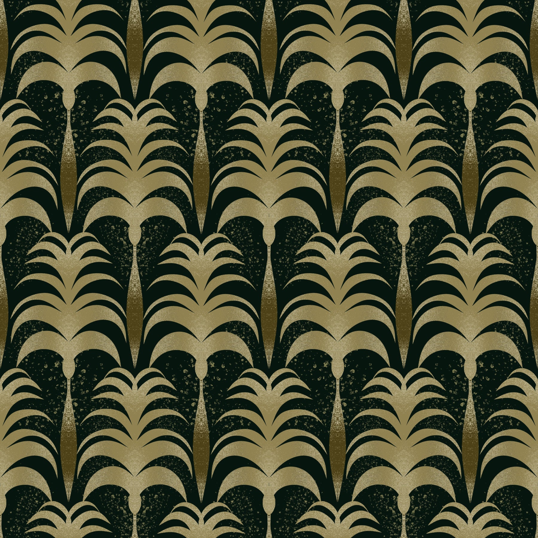 Transform your living space with this stylish wallpaper for walls. This design features a repeating palm pattern with a retro flair. The color palette uses deep greens and gold, creating a sophisticated look. The pattern adds depth to any room, and the dark background brings out the shimmer in the gold elements. This wallpaper complements vintage or modern interiors, bringing a touch of tropical charm. Try it in a living room, dining room, or bedroom to elevate your design.
