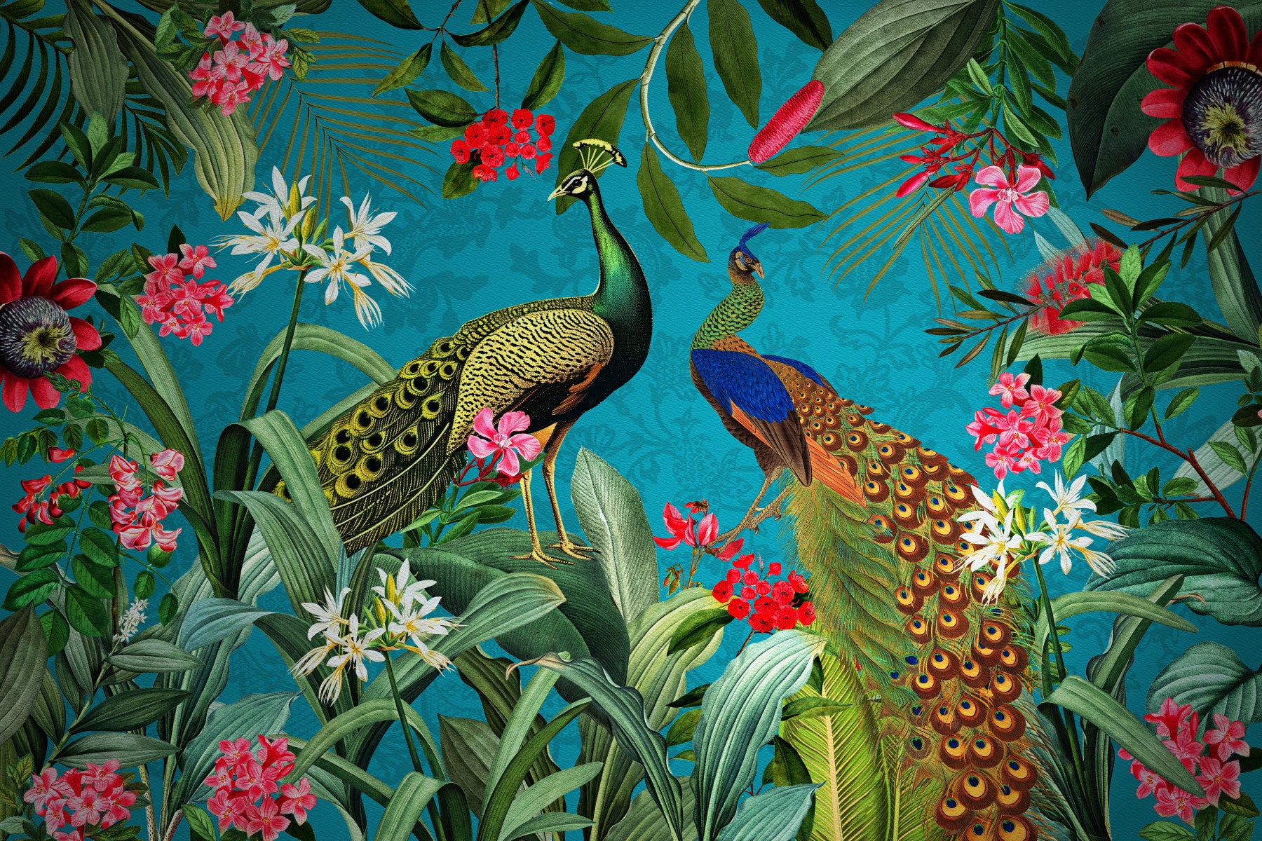 Undslippe til et frodigt, levende paradis med dette vintage-inspirerede tapet. To majestætiske påfugler, der er gengivet i udsøgte detaljer med en rig farvepalet, tager midten af ​​scenen midt i en overflod af eksotiske blomster. Intrikate botaniske illustrationer af livlige lyserøde og røde blomster sammen med elegante hvide liljer sammenflet med frodig grønt løv mod en dyb teal -baggrund. Den vintage æstetik forbedres af en subtil damask-lignende struktur, hvilket skaber en følelse af tidløs skønhed og overdådighed. Dette tapet fremkalder en følelse af ro og eksotisk forundring, perfekt til at tilføje et strejf af vintage charme og naturlig elegance til ethvert rum.