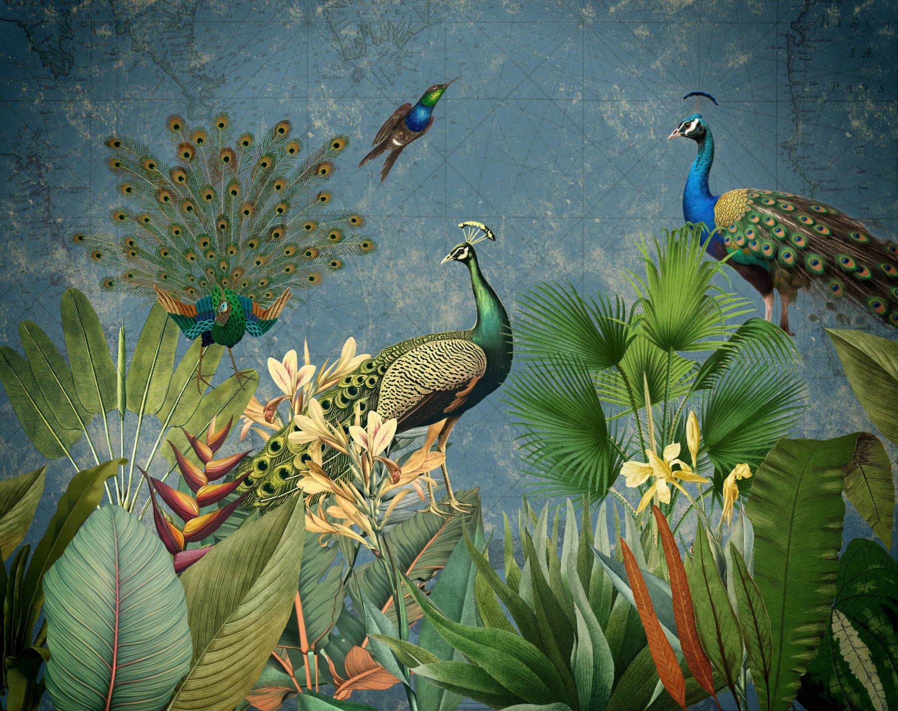 Vintage Peacock Paradise wall mural bringing exotic elegance.