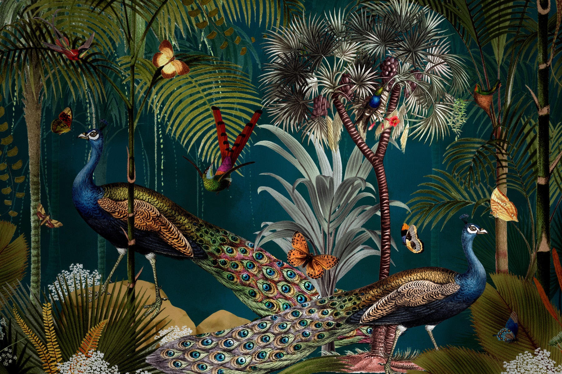 Dyber dig selv i et frodigt, tropisk paradis med dette fængslende tapet. To majestætiske påfugler, der er gengivet i udsøgte detaljer, slentre gennem en pulserende jungle, der vrimler af eksotiske fugle og sommerfugle. Den dybe tealbaggrund forbedrer rigdommen på påfuglens fjerdragt og det omgivende løv, hvilket skaber en følelse af rolig ro. Dette tapet er perfekt til at tilføje et strejf af overdådig, naturlig skønhed til ethvert rum, der omdanner dine vægge til en hemmelig have -flugt.