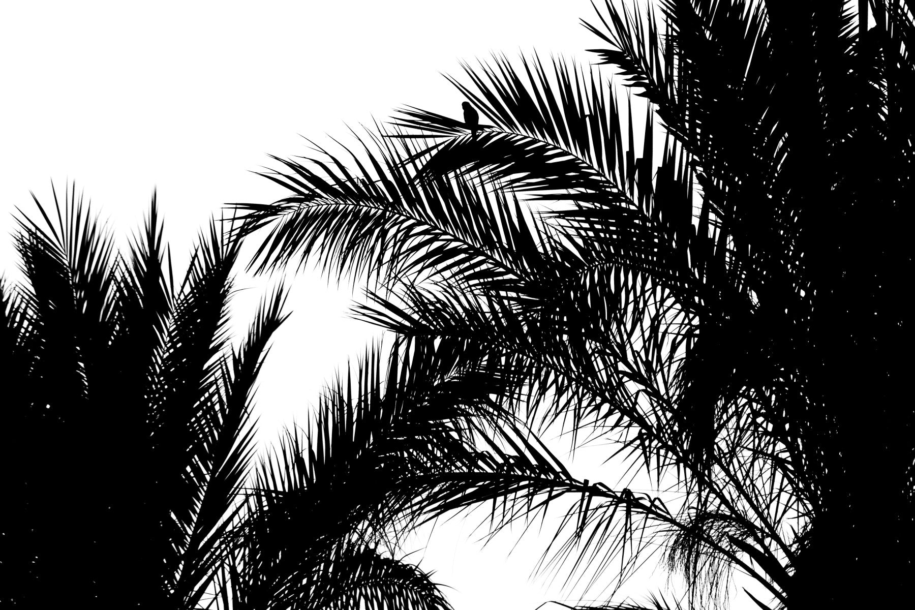 "Waiting II" captures a moment suspended in time, a starkly beautiful silhouette of palm fronds against a bright, empty sky. The monochrome palette enhances the sense of anticipation, a breath held before the horizon shifts. The intricate details of the palm leaves are rendered in sharp contrast, creating a dynamic yet serene composition. This image evokes a feeling of stillness, a pause to appreciate the natural beauty that often surrounds us. It speaks of tropical breezes and sun-drenched days, hinting at a promise of something just beyond reach. Let this wallpaper infuse your space with a calming presence, a reminder to embrace the quiet moments of waiting, for within them lies potential and reflection. Perfect for those who appreciate minimalist aesthetics and a touch of nature's elegance.