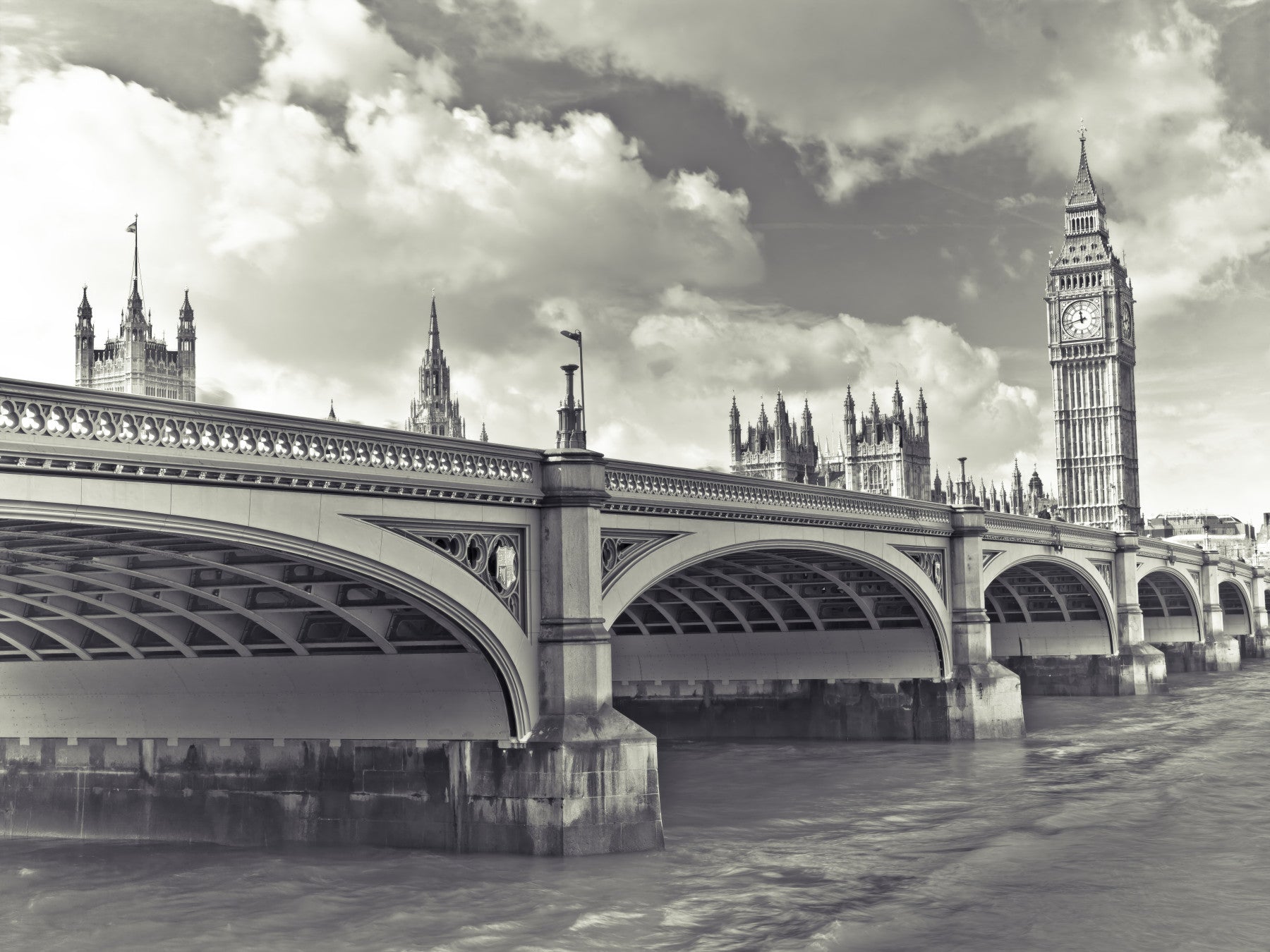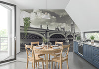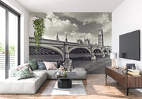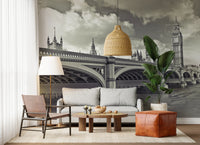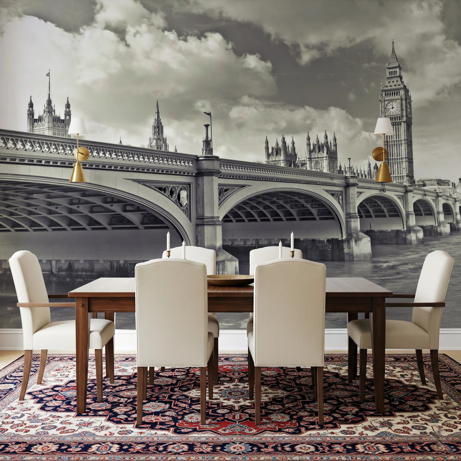 Giv din bolig et fyldigt præg med dette fantastiske urbane vægtapet. Det sort-hvide fotografi fremhæver Londons historiske Westminster og viser Houses of Parliament og Elizabeth Tower (Big Ben) mod en dynamisk himmel. Dette billede leverer et sofistikeret, arkitektonisk design til ethvert rum. Dens neutrale palet fungerer godt i gange, arbejdsværelser eller spisestuer, og kompositionen tilføjer dybde og en følelse af skala. Bring atmosfæren fra en verdenskendt by ind i dit hjem og skab et rum, der er både elegant og tidløst.
