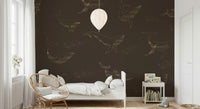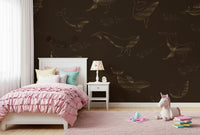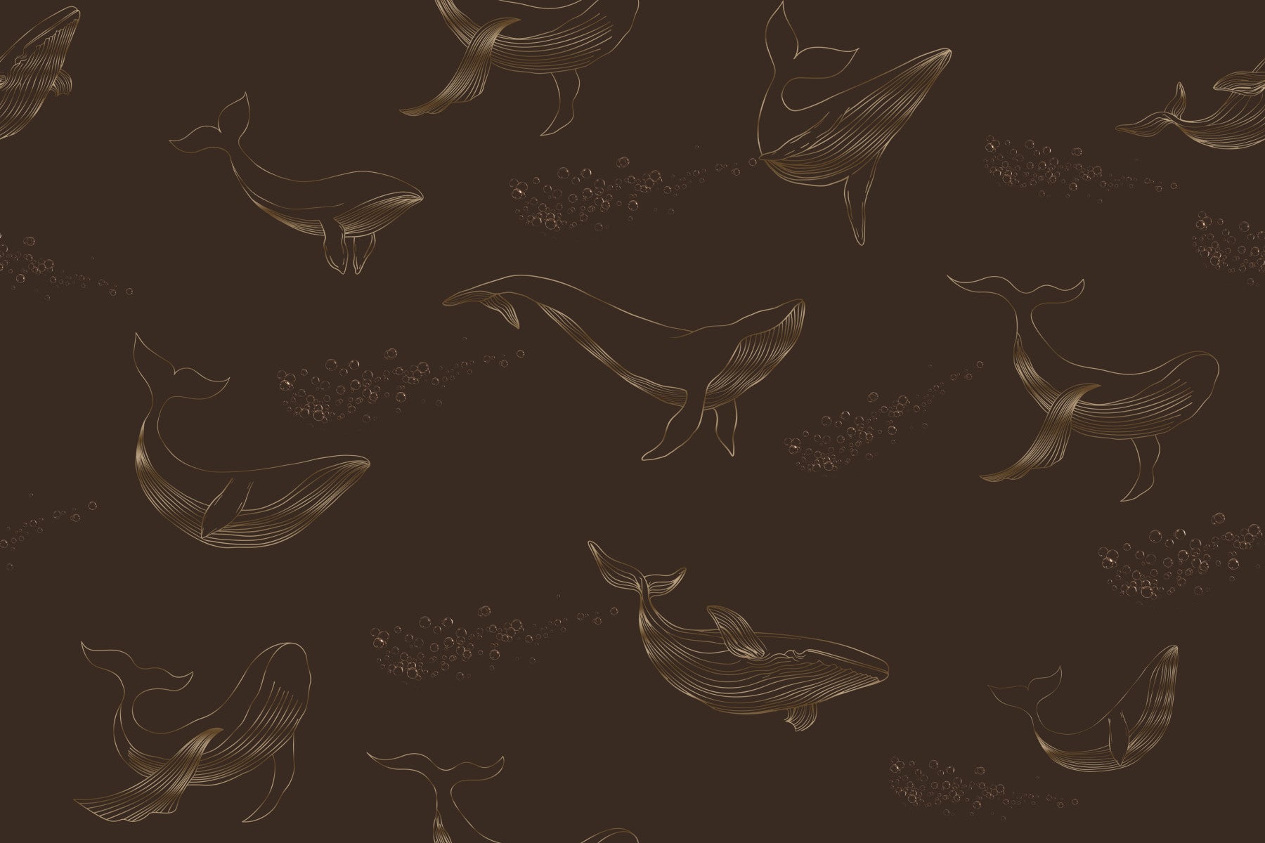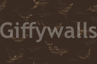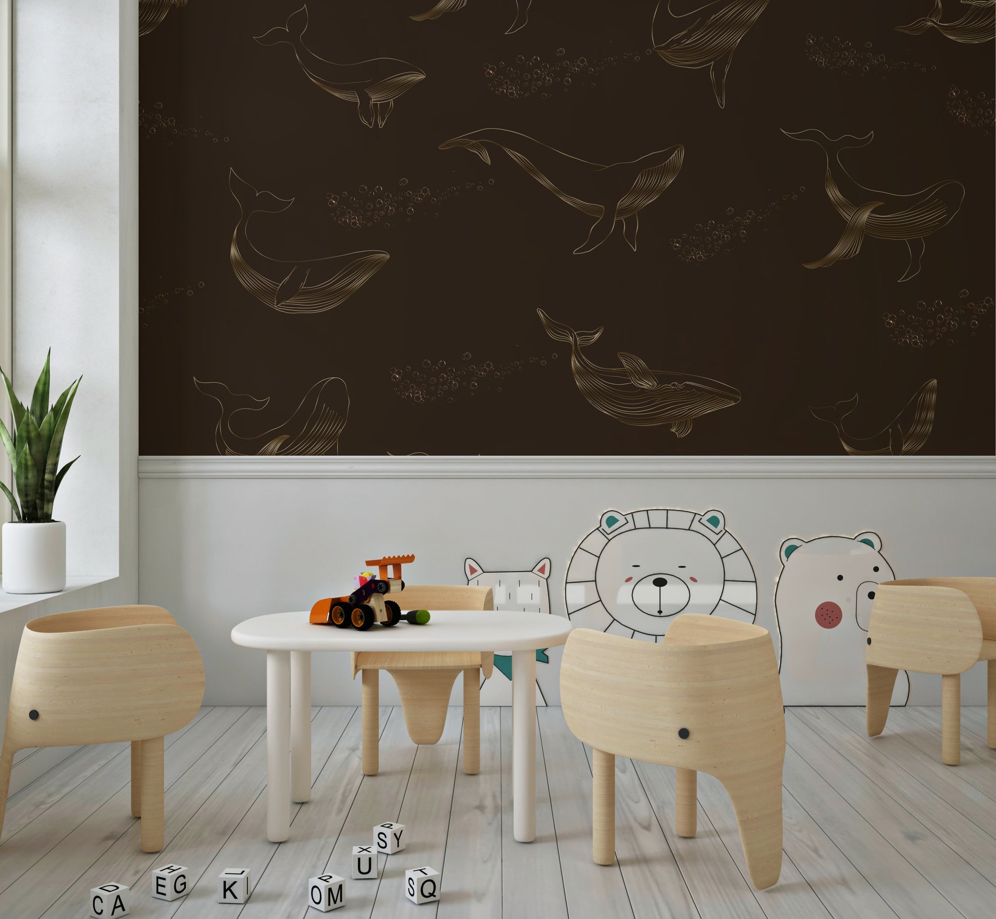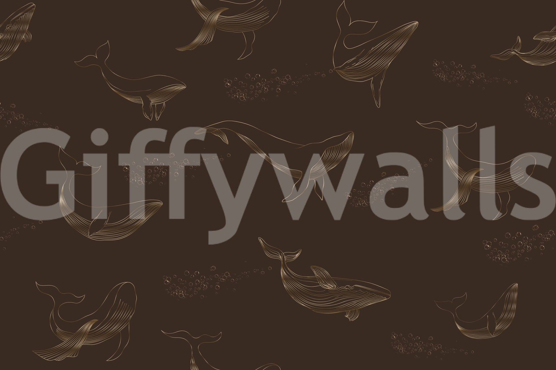 Immerse yourself in the deep with this graceful whale motif. This wallpaper for walls features stylized whale outlines in a warm gold hue swimming across a rich chocolate background. The understated palette brings sophistication to any room, making it perfect for a calming bedroom, a stylish living room, or even a serene home office. This design's elegant lines enhance the architectural details of your space, creating a subtle yet captivating focal point. Gentle bubbles add a whimsical touch, completing this sophisticated, marine-inspired wall decor.