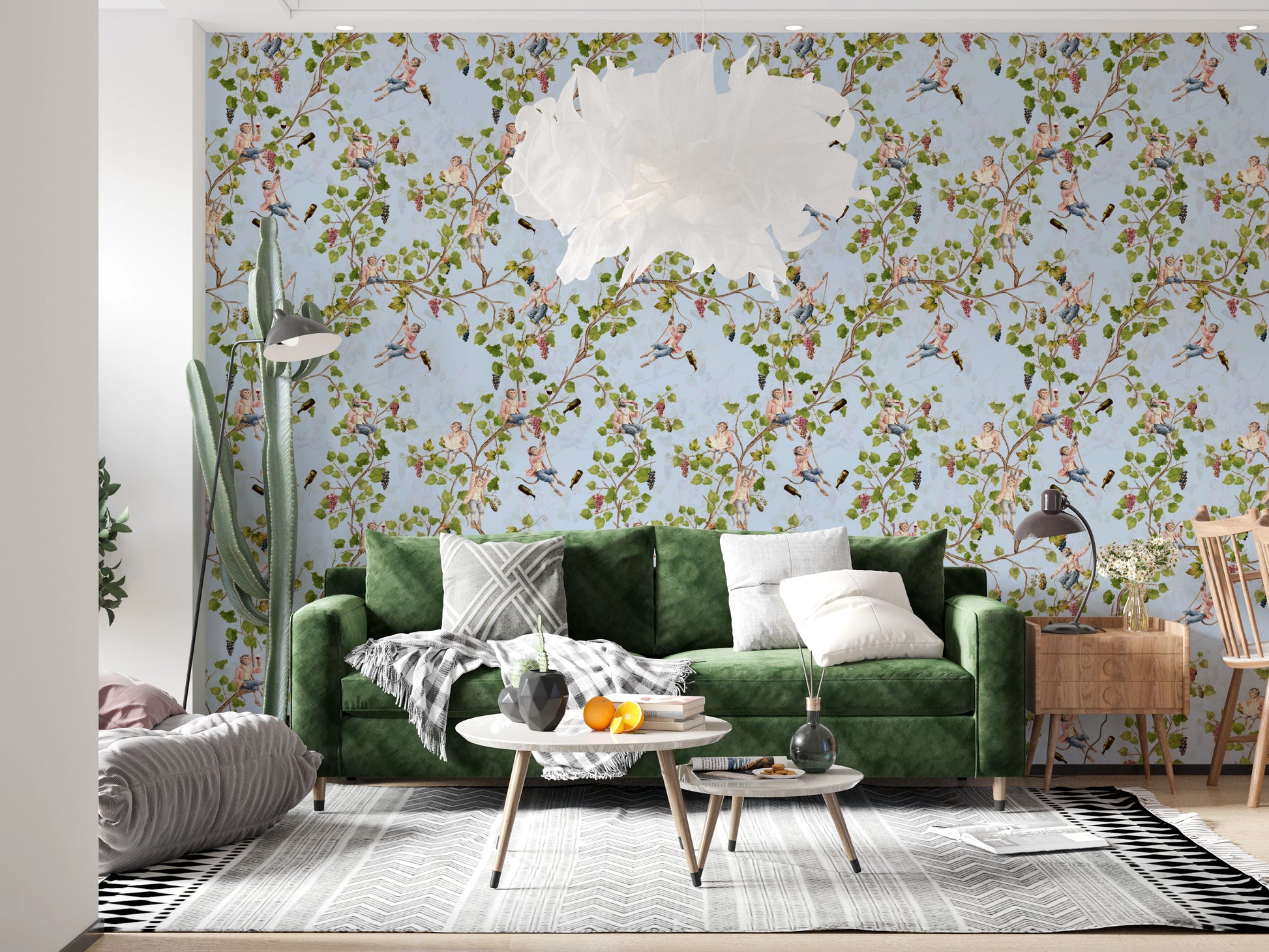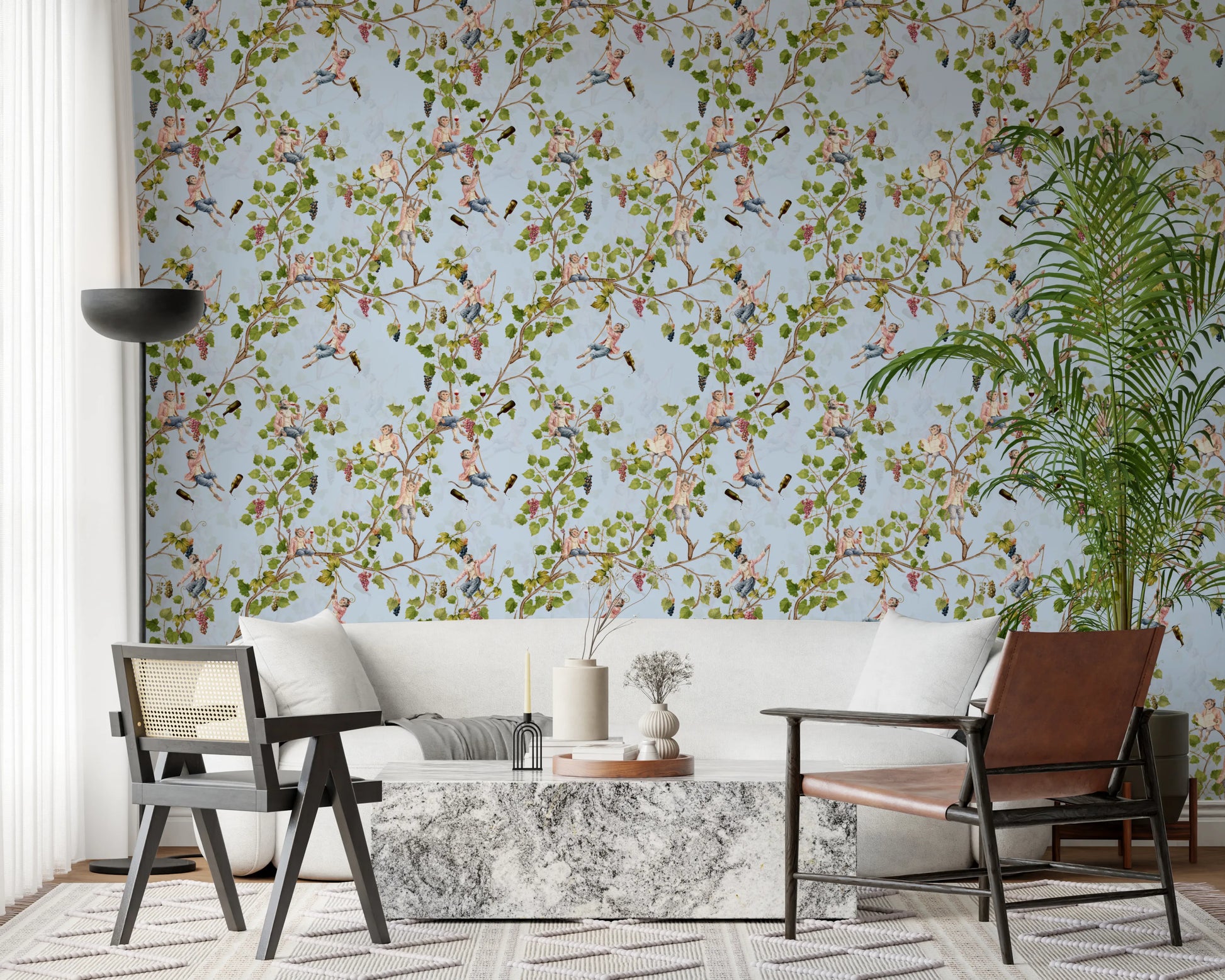 Transporter dig selv til en fantastisk raffineret affære med denne vægdekoration af Uta Naumann. Dette design fremkalder en legende, men elegant atmosfære med drilske aber klædt i rokoko-pragt, der svælger i en overdådig vingård. Frodige vinranker fyldt med moden frugt flettes sammen med disse dejlige figurer, nogle svinger sig i reb, andre læser om vin eller løfter et glas for at skåle for begivenheden. Flasker af vin er også til stede. Den bløde hvide baggrund forstærker den vintage-charme og skaber en lys og luftig fornemmelse. Dette sofistikerede design fremkalder følelsen af en aristokratisk vinfestival afholdt i en vintagehave og er en unik og charmerende tilføjelse, der bringer et strejf af finurlig pragt til ethvert rum.