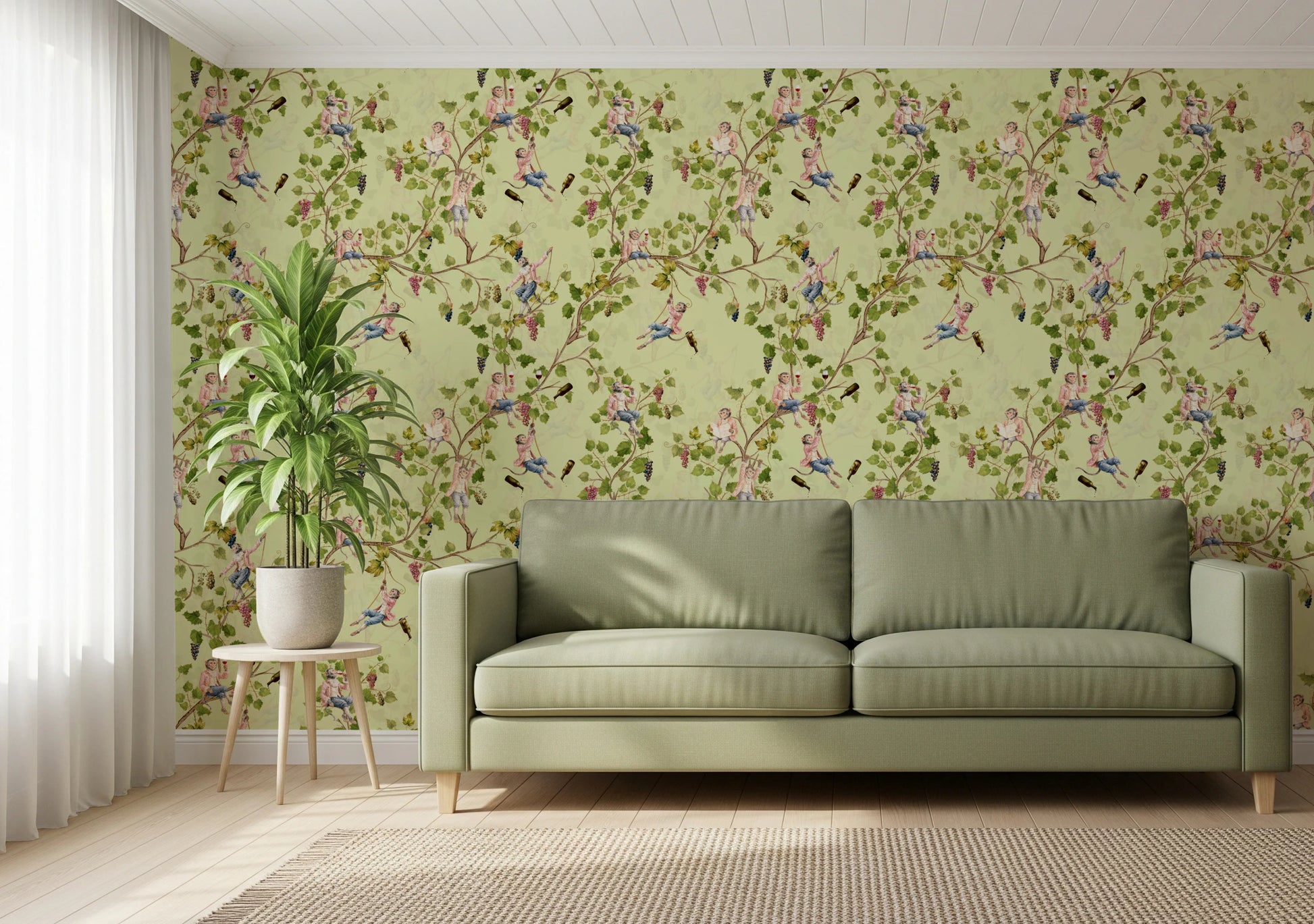 Transporter dig selv til en fantastisk raffineret affære med denne vægdekoration af Uta Naumann. Dette design fremkalder en legende, men elegant atmosfære med drilske aber klædt i rokoko-pragt, der svælger i en overdådig vingård. Frodige vinranker fyldt med moden frugt flettes sammen med disse dejlige figurer, nogle svinger sig i reb, andre læser om vin eller løfter et glas for at skåle for begivenheden. Flasker af vin er også til stede. Den bløde hvide baggrund forstærker den vintage-charme og skaber en lys og luftig fornemmelse. Dette sofistikerede design fremkalder følelsen af en aristokratisk vinfestival afholdt i en vintagehave og er en unik og charmerende tilføjelse, der bringer et strejf af finurlig pragt til ethvert rum.