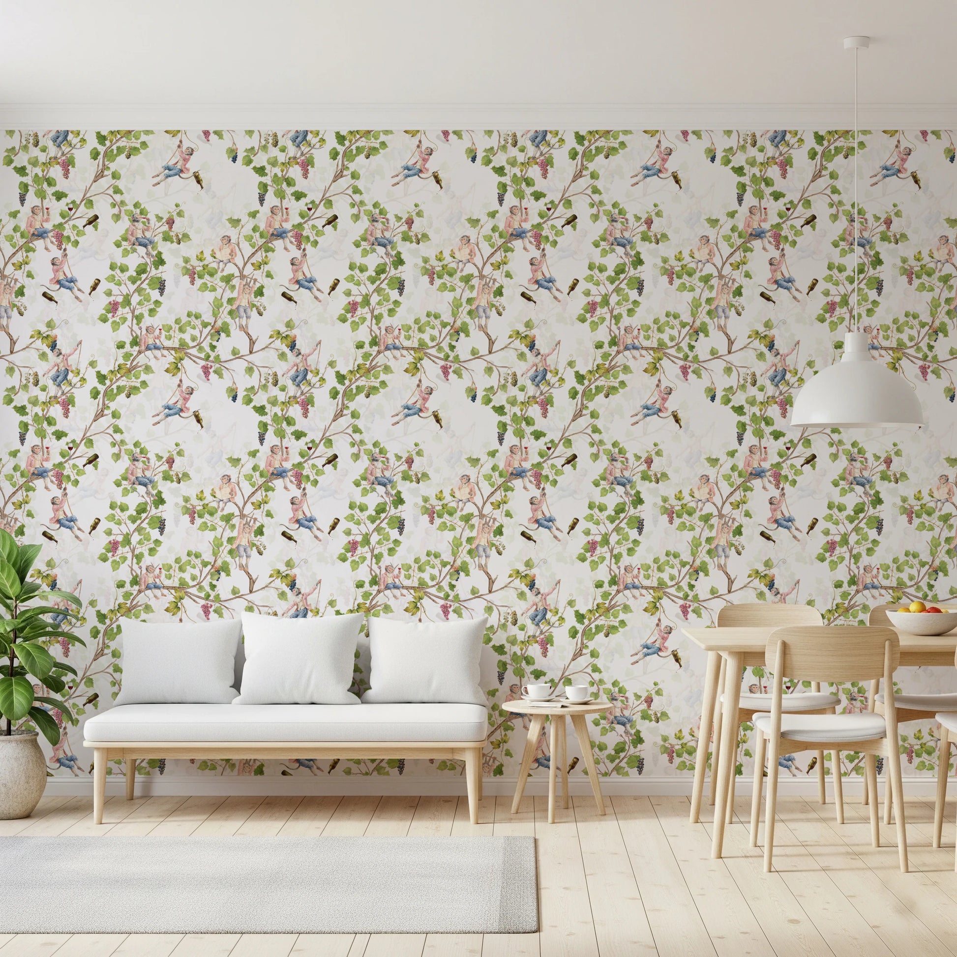 Transporter dig selv til en fantastisk raffineret affære med denne vægdekoration af Uta Naumann. Dette design fremkalder en legende, men elegant atmosfære med drilske aber klædt i rokoko-pragt, der svælger i en overdådig vingård. Frodige vinranker fyldt med moden frugt flettes sammen med disse dejlige figurer, nogle svinger sig i reb, andre læser om vin eller løfter et glas for at skåle for begivenheden. Flasker af vin er også til stede. Den bløde hvide baggrund forstærker den vintage-charme og skaber en lys og luftig fornemmelse. Dette sofistikerede design fremkalder følelsen af en aristokratisk vinfestival afholdt i en vintagehave og er en unik og charmerende tilføjelse, der bringer et strejf af finurlig pragt til ethvert rum.