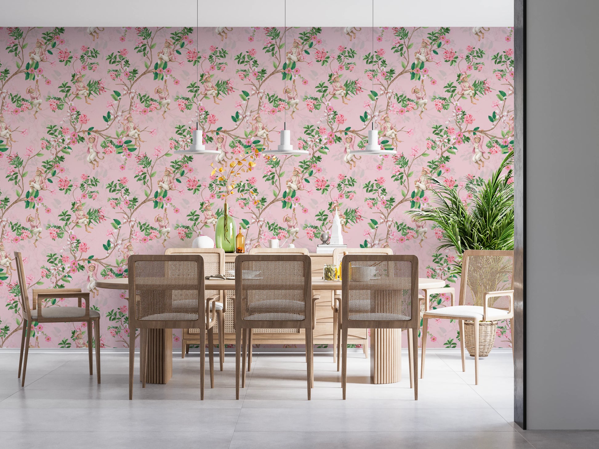 Transporter dig selv til en svunden æra med aristokratisk festlighed med denne udsøgt detaljerede vægbeklædning af Uta Naumann. Forestil dig en vintage vingårdshavefest, hvor legende klædte aber, iført charmerende rokoko-dragter, boltrer sig blandt blomstrende grene fyldt med sarte lyserøde blomster. Elegante bånd pryder grenene og antyder de luksuriøse festligheder, der udfolder sig i disse idylliske omgivelser. Den hvide baggrund fremhæver kunstværket, mens en dæmpet palet tilføjer et strejf af falmet pragt, hvilket gør dette design ideelt til at skabe et rum, der er både finurligt og raffineret. Perfekt til at tilføje et strejf af finurlig elegance til ethvert rum, legemliggør dette design ånden af en munter og sofistikeret fest.