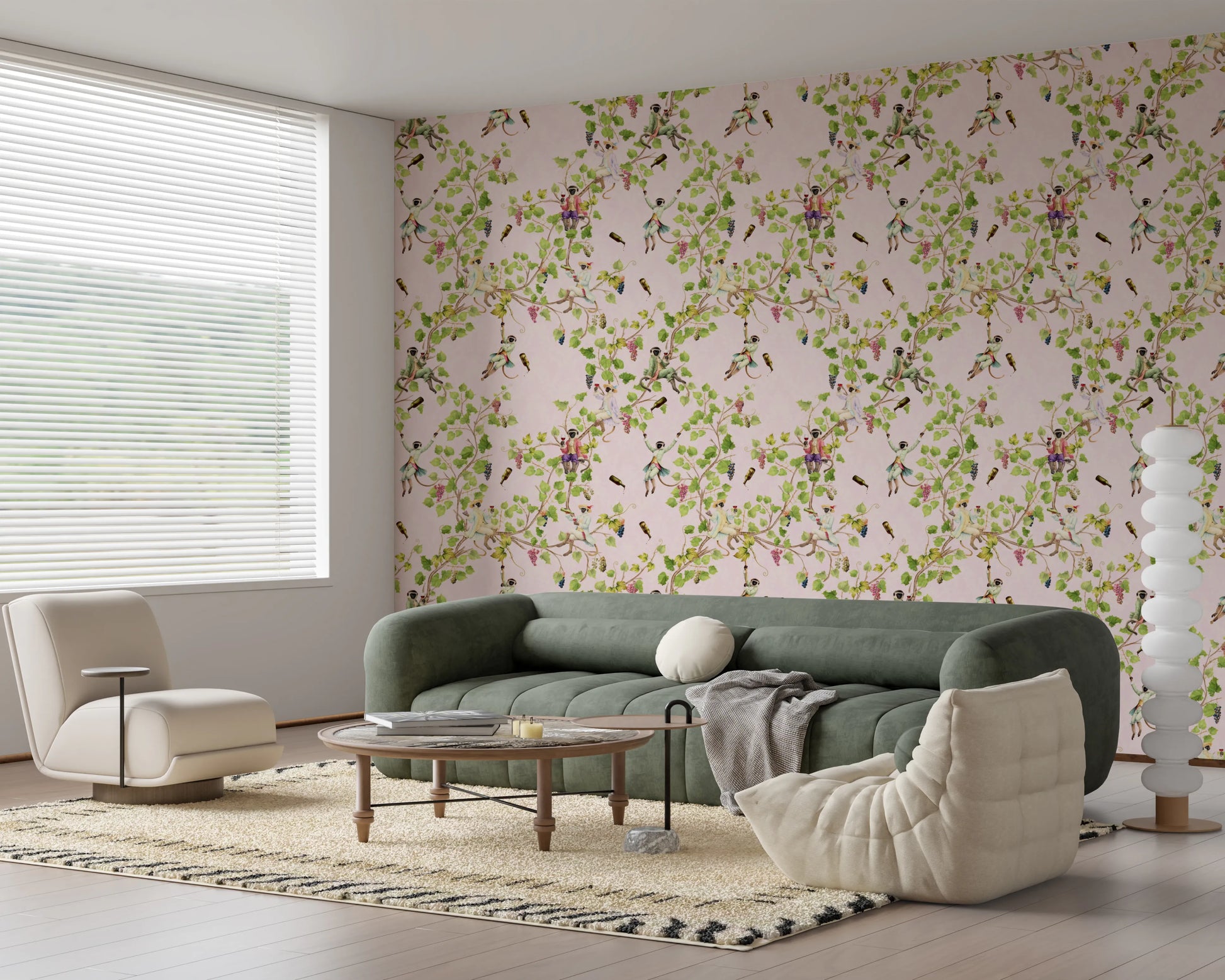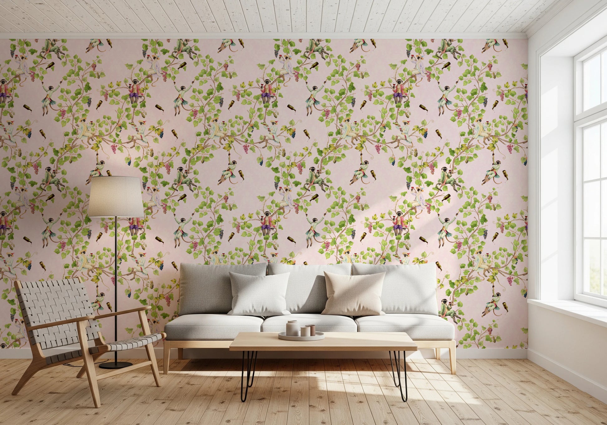 Forvandl dit rum til en scene af raffineret festlighed med denne unikke vægdekoration af Uta Naumann. Forestil dig drilske aber, klædt i finurlig rokoko-pragt, der boltrer sig midt i frodig vingårdsløv. Forestil dig en svunden tid, hvor disse primat-aristokrater er vært for en dekadent vinfestival, komplet med kaskader af druer og overfyldte flasker. Den vintage-æstetik kombineret med den uberørte hvide baggrund skaber en atmosfære af både legende ekstravagance og klassisk elegance. Giv dit rum et strejf af aristokratisk charme og den muntre ånd fra en vingårdshave. Lad de finurlige aber bringe et smil frem på dit ansigt, når de forvandler dine vægge til en dejlig samtaleemne.