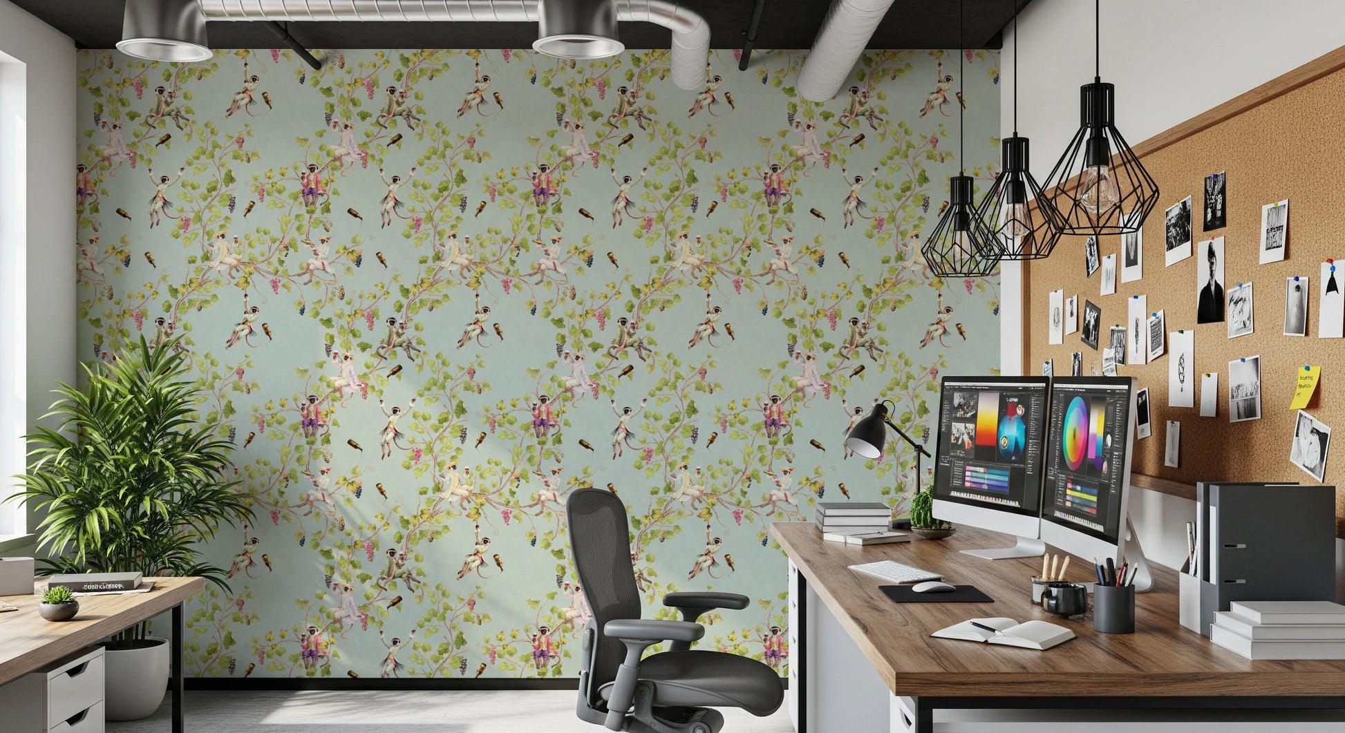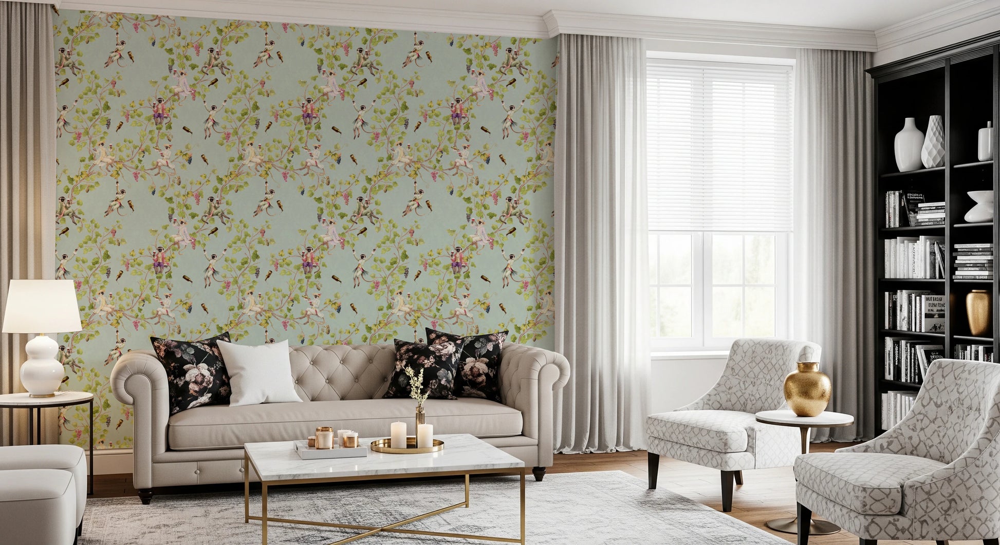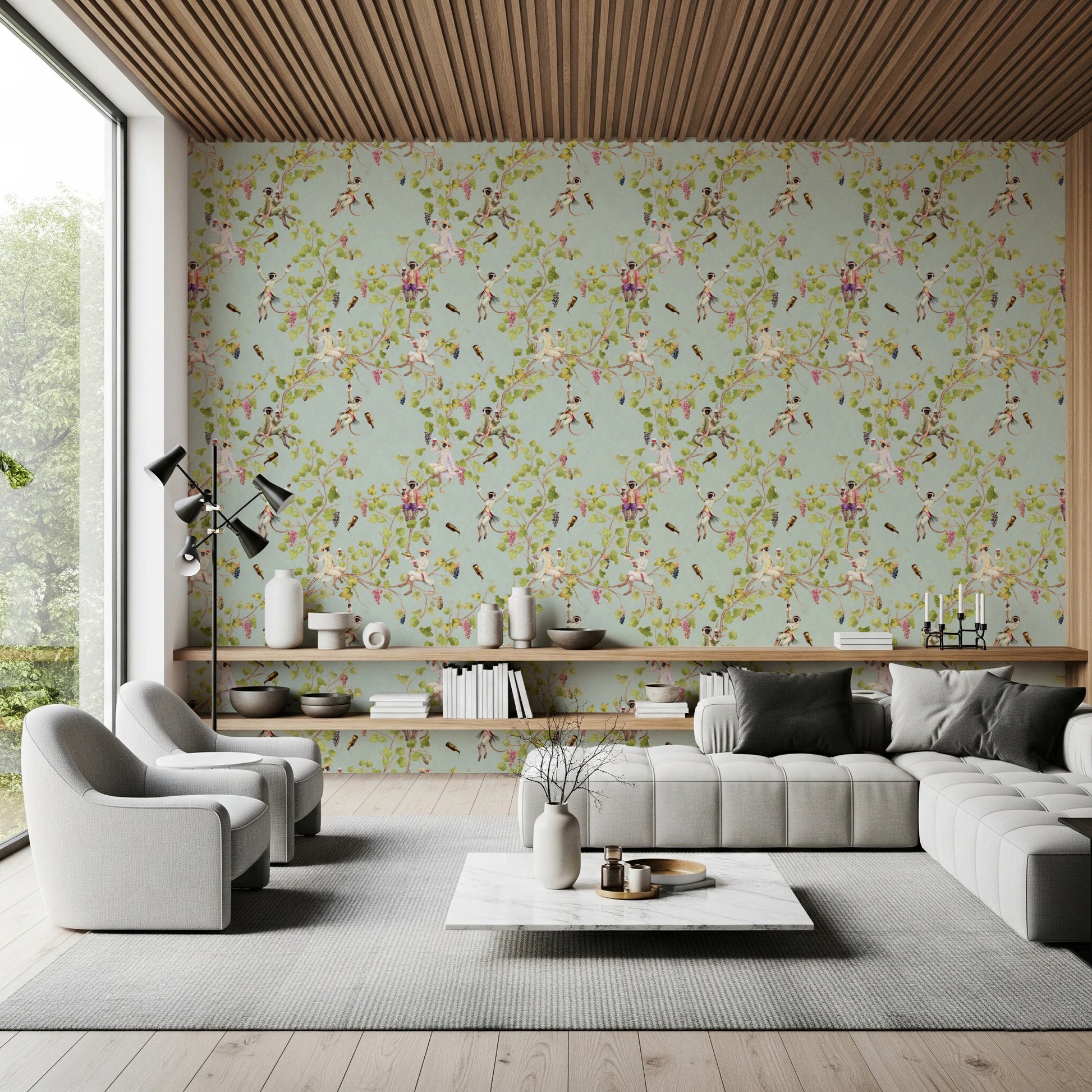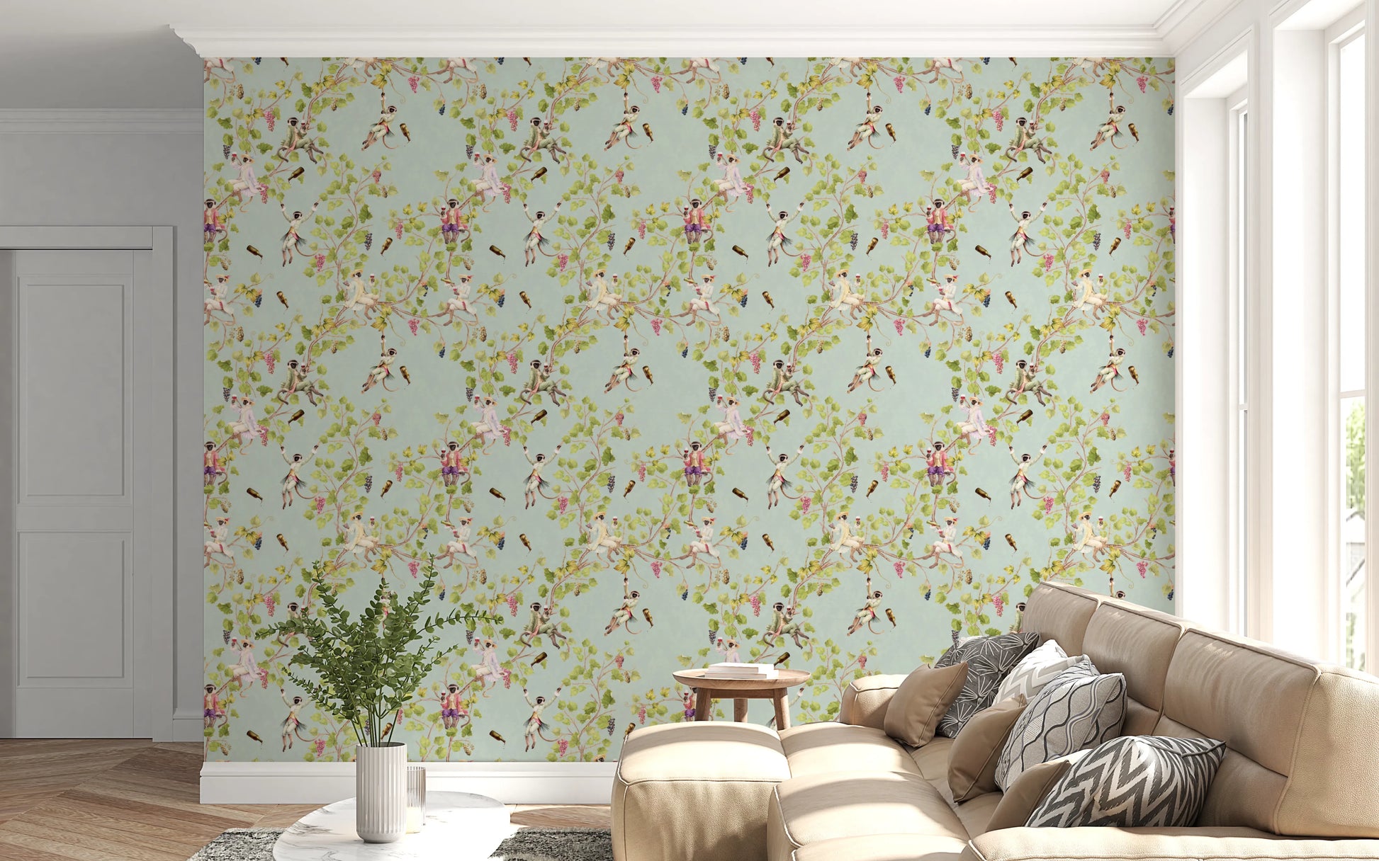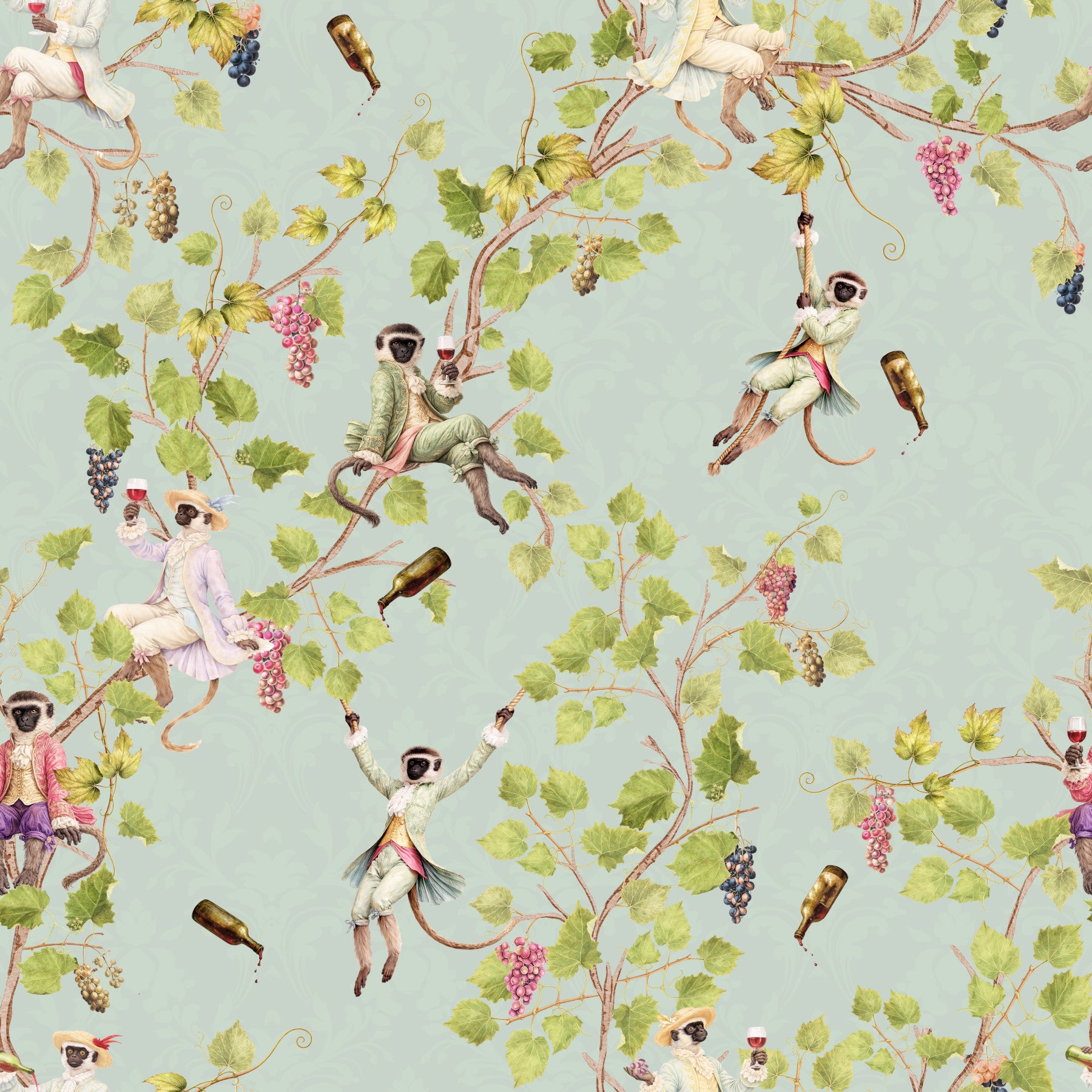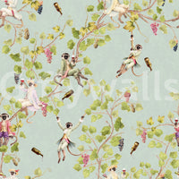 Forvandl dit rum til en scene af raffineret festlighed med denne unikke vægdekoration af Uta Naumann. Forestil dig drilske aber, klædt i finurlig rokoko-pragt, der boltrer sig midt i frodig vingårdsløv. Forestil dig en svunden tid, hvor disse primat-aristokrater er vært for en dekadent vinfestival, komplet med kaskader af druer og overfyldte flasker. Den vintage-æstetik kombineret med den uberørte hvide baggrund skaber en atmosfære af både legende ekstravagance og klassisk elegance. Giv dit rum et strejf af aristokratisk charme og den muntre ånd fra en vingårdshave. Lad de finurlige aber bringe et smil frem på dit ansigt, når de forvandler dine vægge til en dejlig samtaleemne.