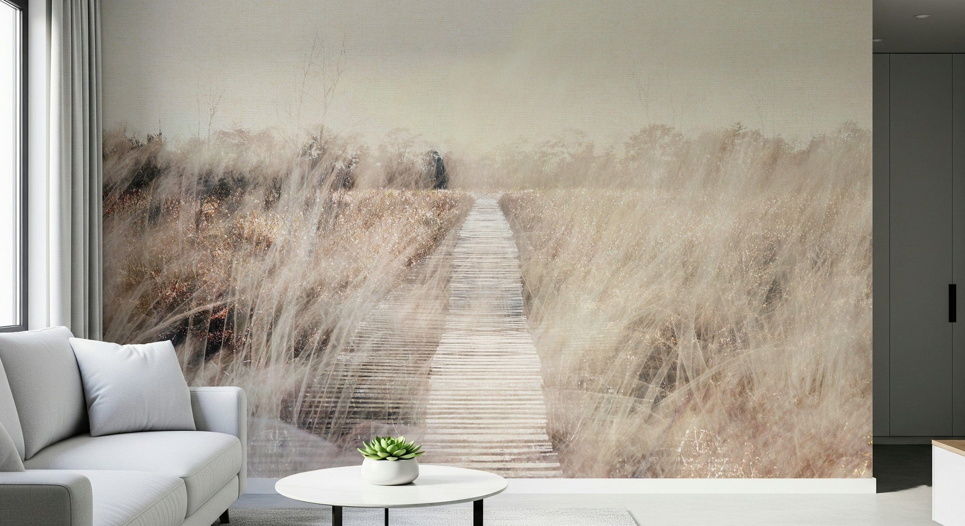 Bring a touch of serene nature indoors with this evocative wallpaper for walls. This design blends soft textures and delicate light to create an atmosphere of calm. The path draws the eye into a hazy distance, framed by gentle grasses. Neutral tones provide a versatile backdrop. It works well in bedrooms, living rooms, or hallways, creating a space that feels open and airy. Its understated design enhances interiors without overwhelming them.