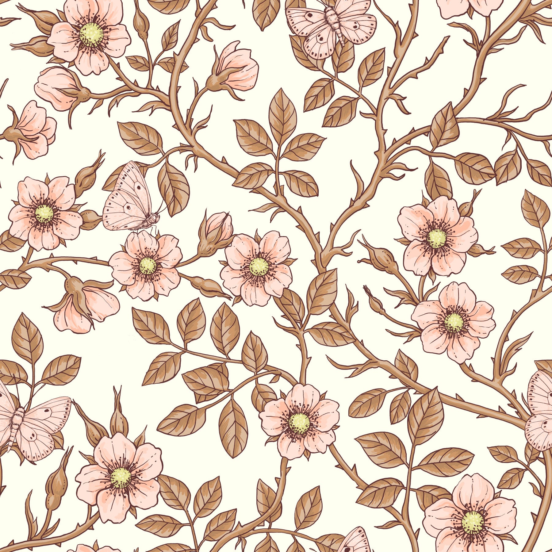 Omfavne den delikate charme i naturen med denne "vilde roser og sommerfugle" tapet. Et billedteppet af rødme lyserøde vilde roser flettes sammen med yndefulde brune grene, deres komplicerede blade tilføjer dybde og struktur. Lige sommerfugle, gengivet i subtile lyserøde og brune nuancer, fladder blandt blomsterne, hvilket skaber en følelse af luftig lethed. Den bløde, off-white baggrund giver et blidt, neutralt lærred, der tillader blomster- og insektmotiver at tage centrum. Dette tapet fremkalder en følelse af rolig skønhed, perfekt til at skabe en beroligende og indbydende atmosfære i ethvert rum. Dets klassiske design sikrer en tidløs elegance, der blandes problemfrit med en række interiørstilarter. Et sofistikeret valg for elskere af botanisk kunst og undervurderet luksus.