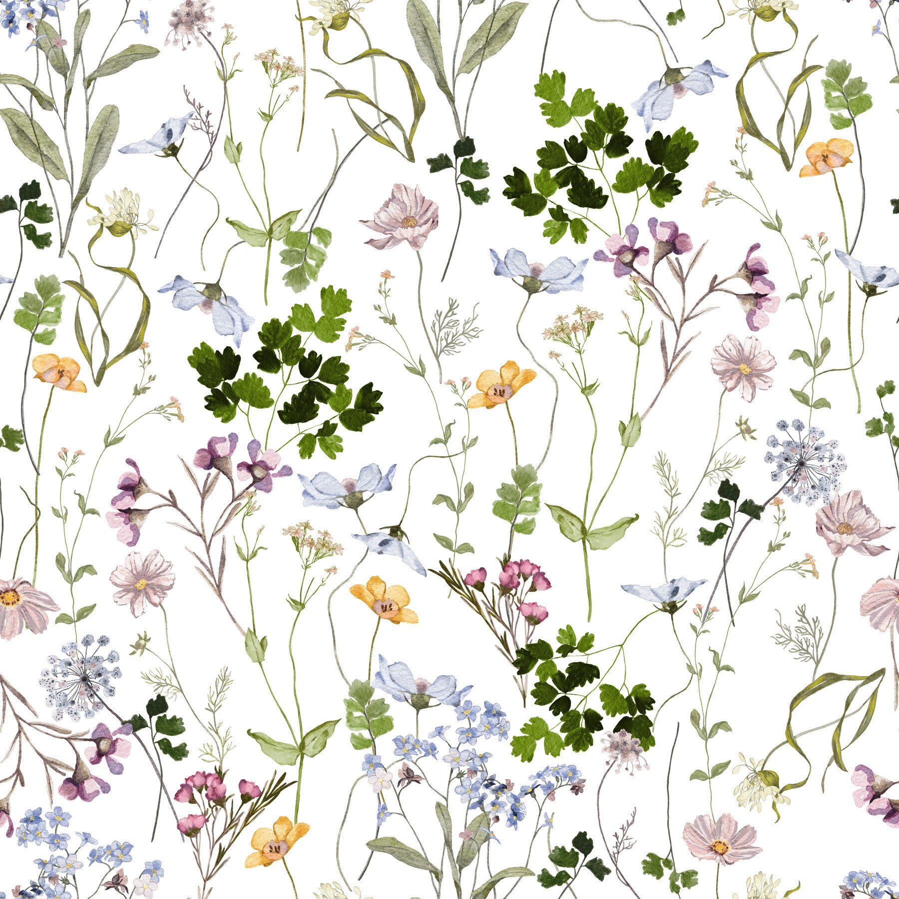 Transform your living space with the serene beauty of this wildflower meadow wallpaper for walls by Uta Naumann. Delicate watercolor blossoms in hues of blues, yellows, pinks, and purples dance across a clean white background, creating a calm and inviting atmosphere. The hand-painted style brings a touch of nature indoors, perfect for bedrooms, living rooms, or hallways. Let this pattern instill a sense of tranquility and subtle elegance, harmonizing effortlessly with a range of interior design styles from classic to modern. This design enhances natural light and brings a refreshing look to your rooms.