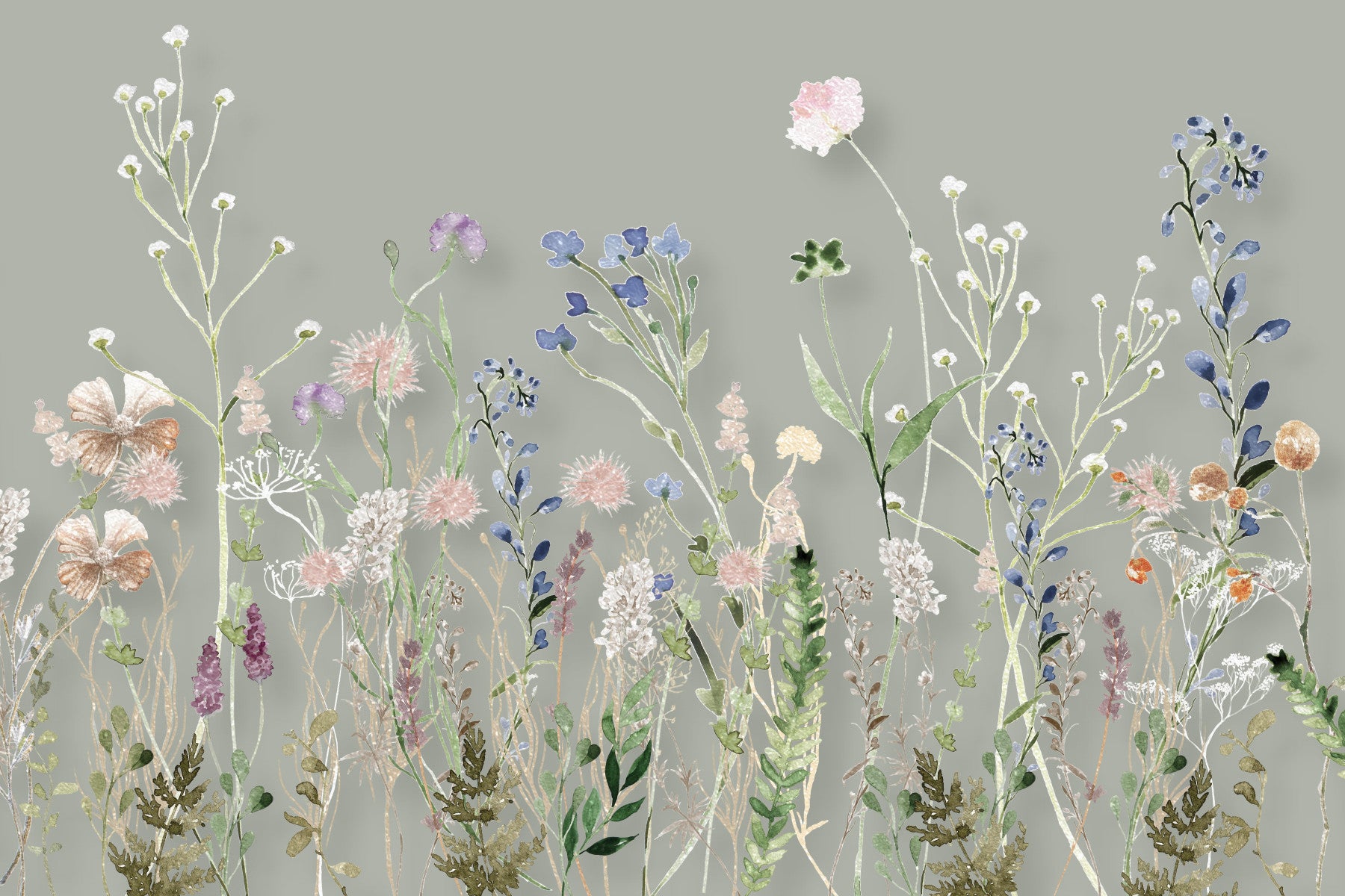 A floral wallpaper with hand-painted wildflowers rising gracefully from the bottom of the mural.