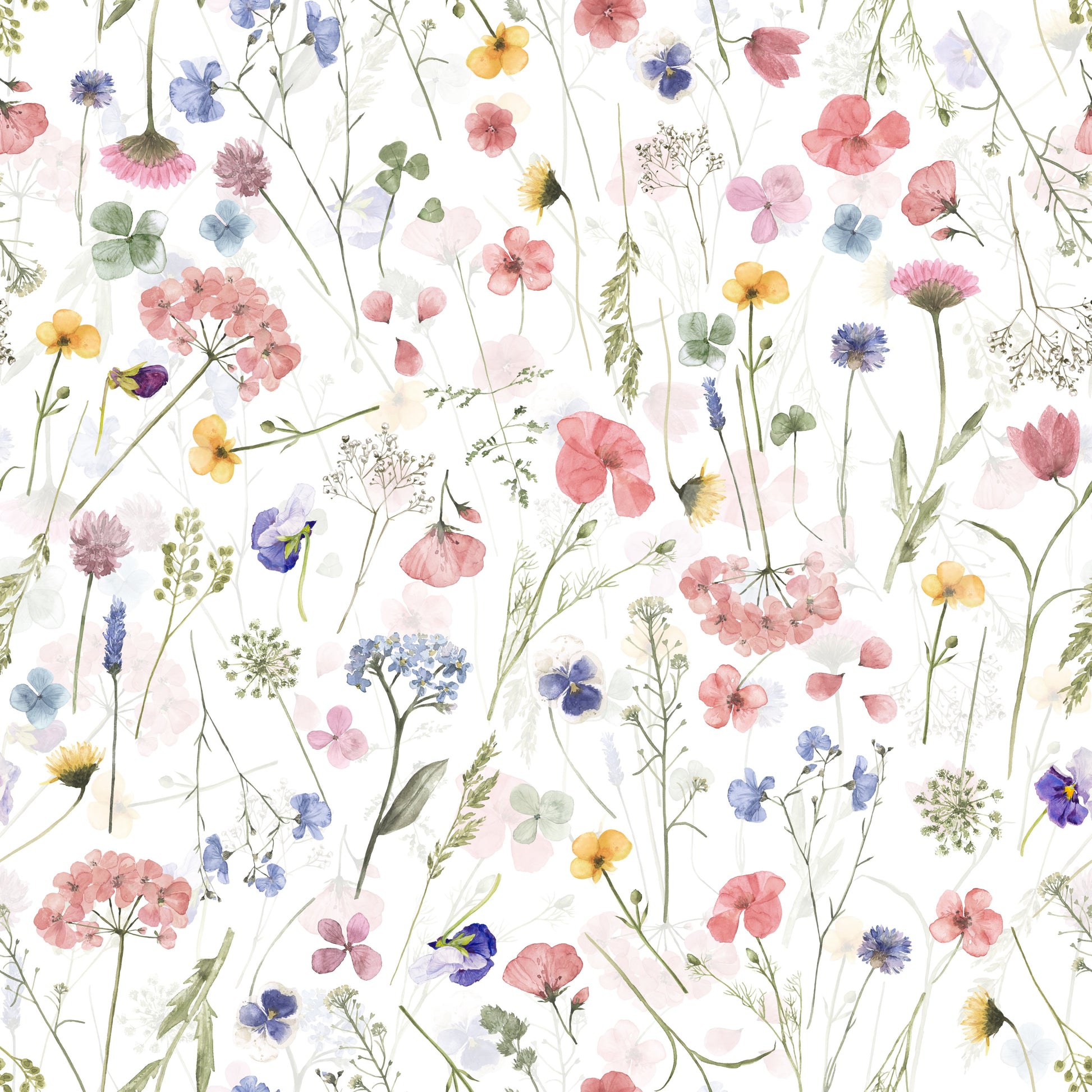 Invite a touch of nature with this watercolor wildflower design by Uta Naumann. The wallpaper for walls depicts a delicate arrangement of wildflowers and grasses in pastel pinks, yellows, and blues. This seamless pattern evokes a calm and joyful feeling, ideal for bedrooms, living rooms, and nurseries. Its light background and watercolor style makes it an easy fit for a range of decor styles. The subtle brushstrokes add depth and create a relaxing atmosphere. This design complements both modern and traditional homes and brings a breath of fresh air to any interior.