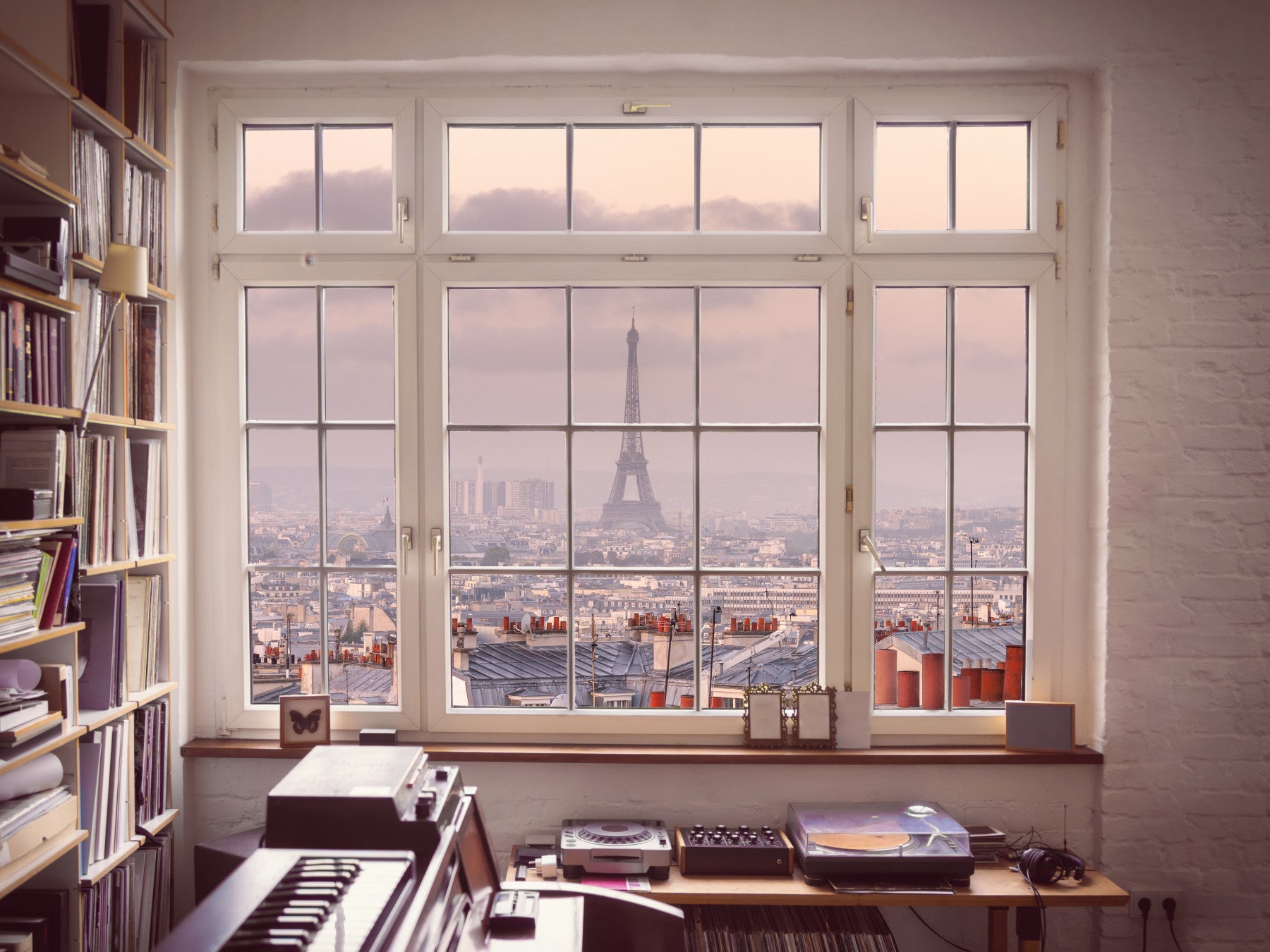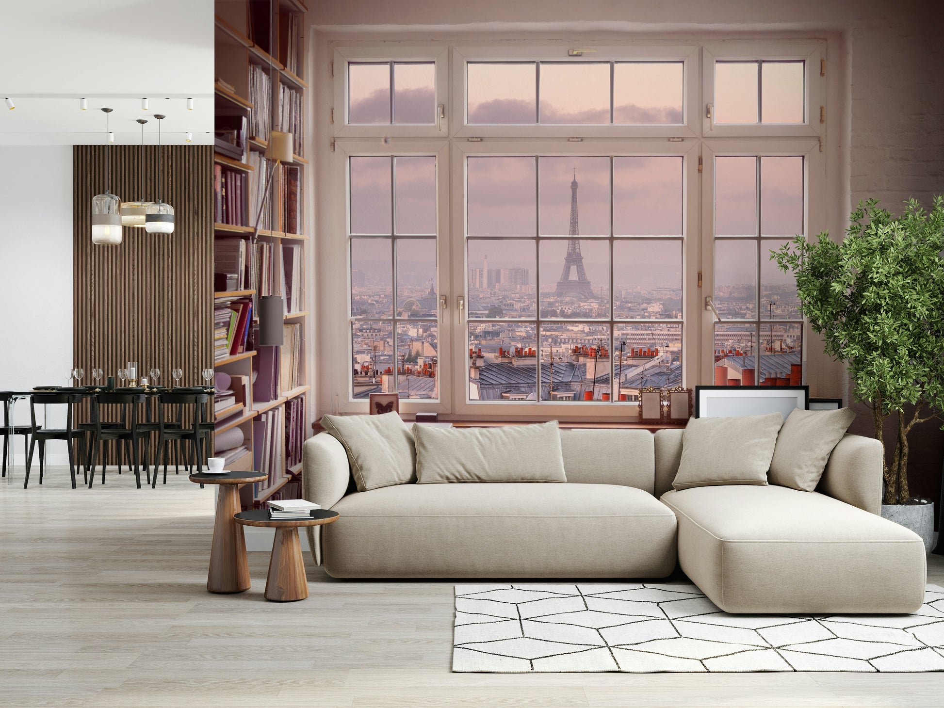 Escape to the city of love with this gorgeous wallpaper. Imagine waking up to a soft pink Parisian sunrise every day! This wallpaper for walls shows a breathtaking view of Paris from a window. The subtle blush and gray tones provide a gentle, calming effect. Perfect for a bedroom, study, or even a hallway, this design adds a touch of Parisian chic and a feeling of openness to any interior. It's a dream for travel lovers and those seeking a touch of romance.