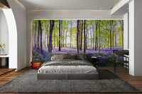 Immerse yourself in a peaceful woodland scene with this captivating wallpaper. Vibrant purple flowers stretch across the forest floor, contrasting beautifully with the green leaves and tall trees. Light shines through the trees, adding a warm glow. This wallpaper for walls makes a statement in any room. It enhances bedrooms, living rooms, or hallways. It complements rustic, farmhouse, and modern styles, bringing a touch of nature inside.