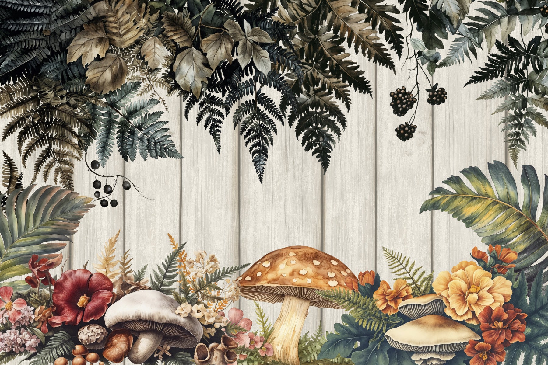 Woodland Vibes Fern Forest Mushrooms vægmaleri