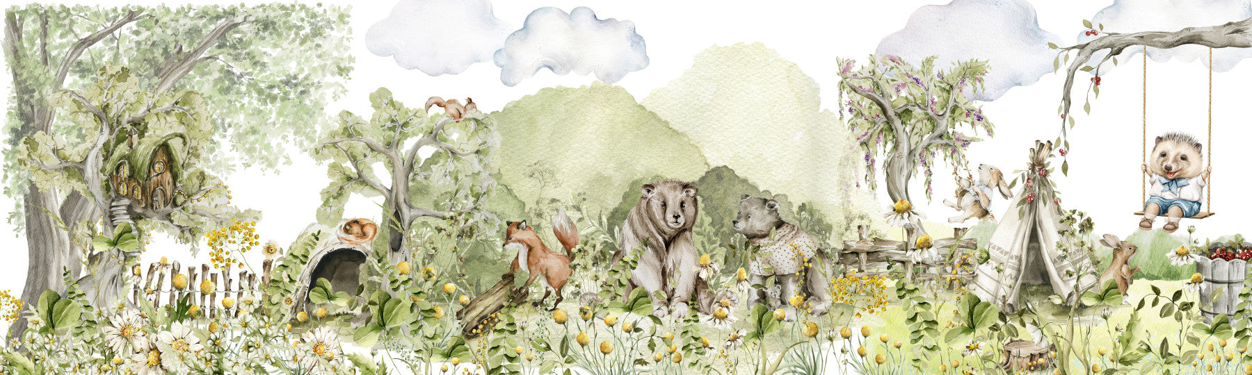 Inviter naturens charme indendørs med denne akvarelskovscene af Uta Naumann. Blide greener og gule skaber et fredeligt landskab fyldt med yndig dyr. Dette design har et træhus, bjørne, en ræv og en svingende pindsvin, ideel til at skabe en hyggelig atmosfære. Den bløde farvepalet og finurlige stil gør det til et perfekt tapet til vægge i et børnehave, børneværelse eller legerum. Lad dette dejlige mønster forbedre dit interiør med dets legende og indbydende æstetik.
