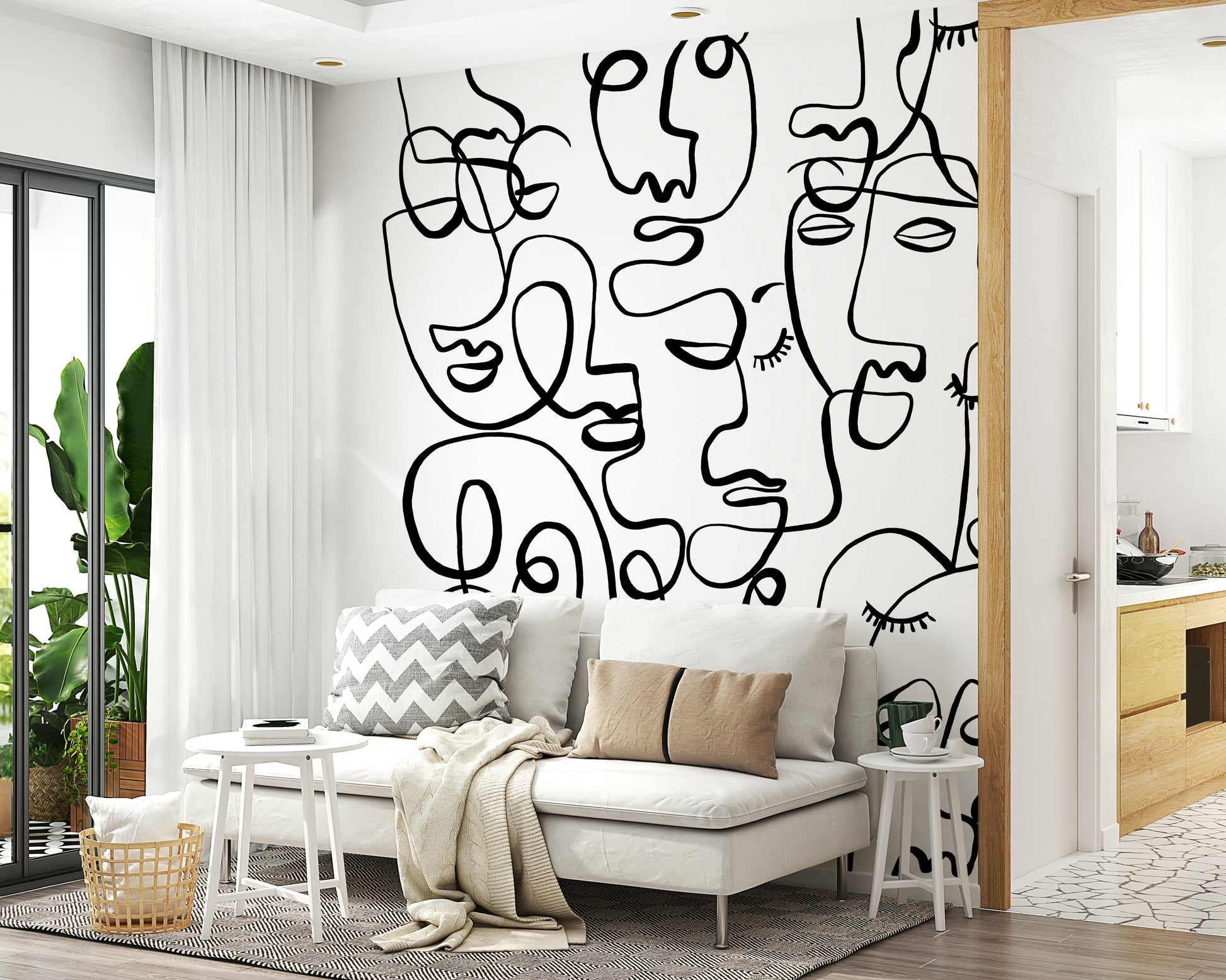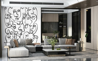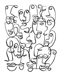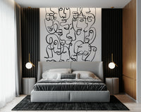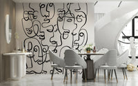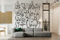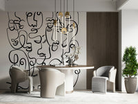 Verleihen Sie Ihrem Interieur mit dieser ausdrucksstarken Gesichtstapete Charakter. Die ausdrucksstarke Wandtapete zeigt abstrakte Porträts aus durchgehenden, geschwungenen Linien. Der starke Kontrast der schwarzen Linien auf weißem Hintergrund erzeugt einen eindrucksvollen visuellen Effekt, ideal für moderne Räume. Das Design setzt in jedem Zimmer ein Statement, vom urbanen Wohnzimmer bis zum trendigen Jugendzimmer. Der grafische Stil bietet einen einzigartigen Blickfang, erzeugt Tiefe und harmoniert mit verschiedenen Einrichtungsstilen. Verwandeln Sie einen schlichten Raum mit diesem kühnen und faszinierenden Design in eine moderne Kunstinstallation.