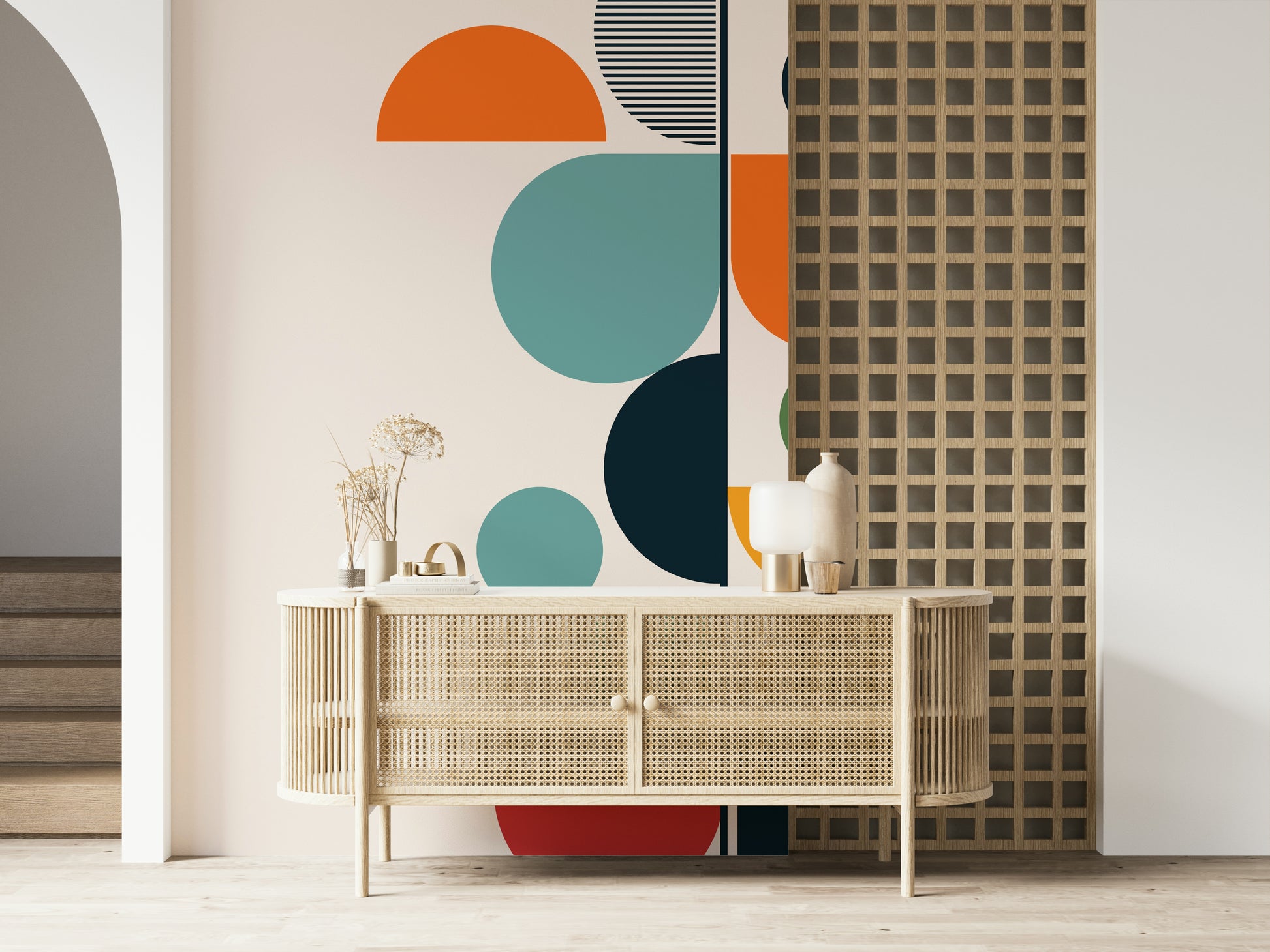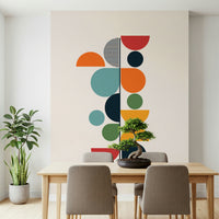 Erleben Sie die Essenz der Erneuerung mit „Bauhaus – Frühling“, einem markanten geometrischen Design, das den Geist der Wiedergeburt verkörpert. Die Komposition aus klaren Linien und kraftvollen Kreisformen fängt die Bauhaus-Ästhetik mit einem Hauch von Frühlingsfrische ein. Sonnige Orange-, warme Rot- und erdige Grüntöne stehen im Kontrast zu beruhigendem Türkis und tiefem Blau und erinnern an das Erwachen der Natur. Die bewusste Anordnung von Halb- und Vollkreisen erzeugt einen dynamischen visuellen Rhythmus, der den Blick nach oben lenkt und an neues Wachstum erinnert, das sich dem Licht entgegenstreckt. Ein dezentes Streifenmuster verleiht diesem modernen Stück zusätzliche Struktur und optische Reize. Bringen Sie die frische, optimistische Energie des Frühlings in Ihr Zuhause mit dieser einzigartigen Wanddekoration – ideal, um einen zeitlosen und zugleich modernen Blickfang zu schaffen.