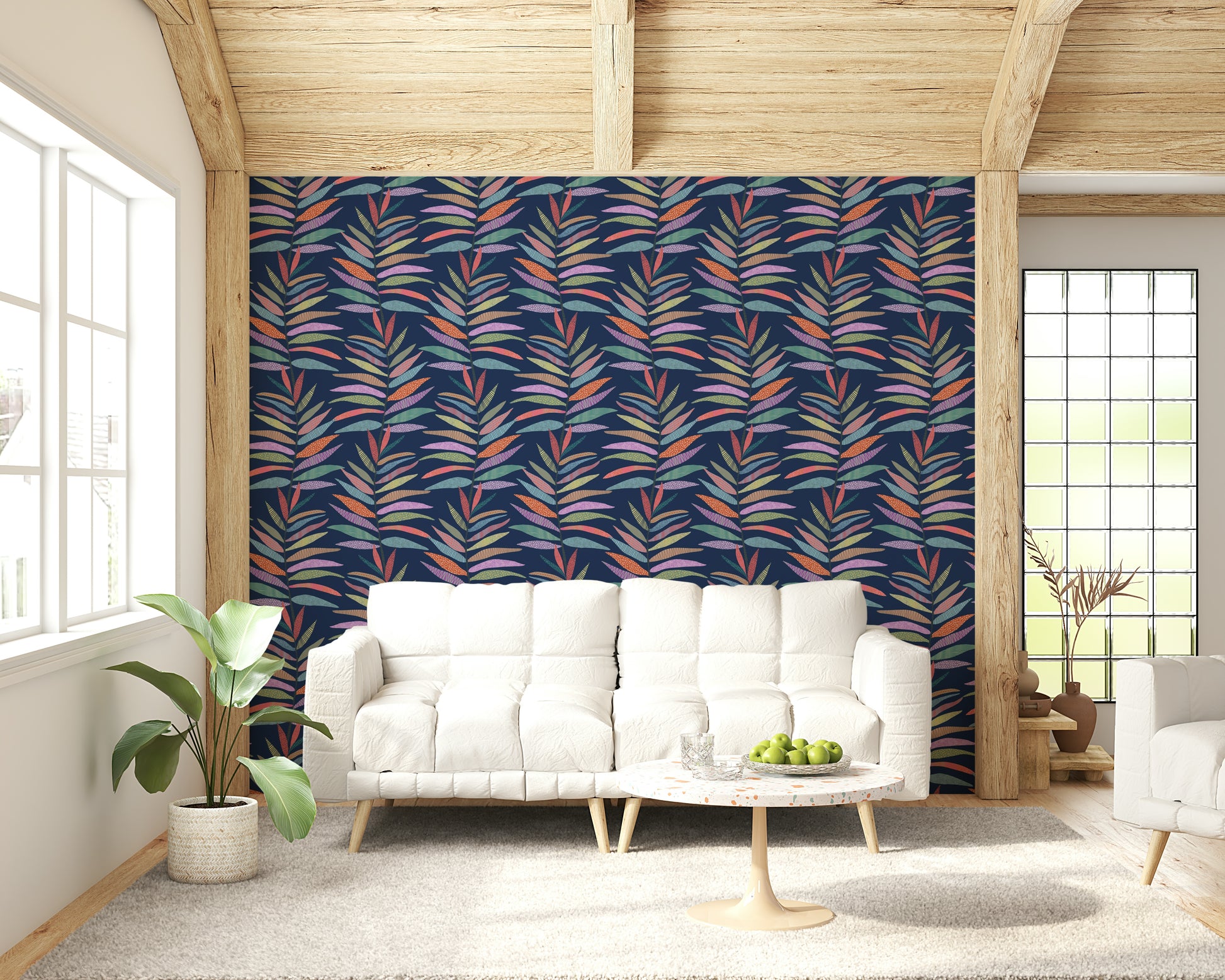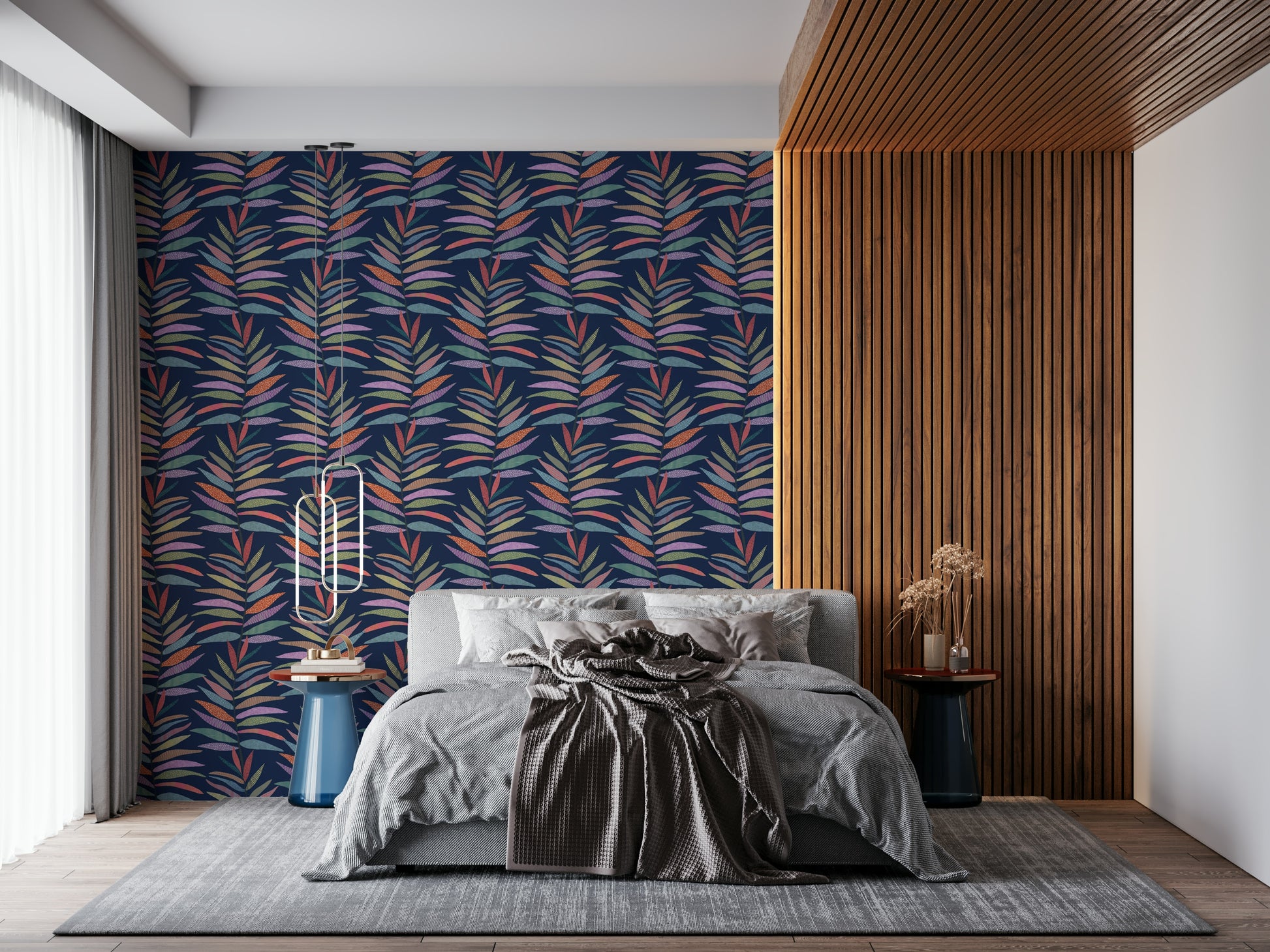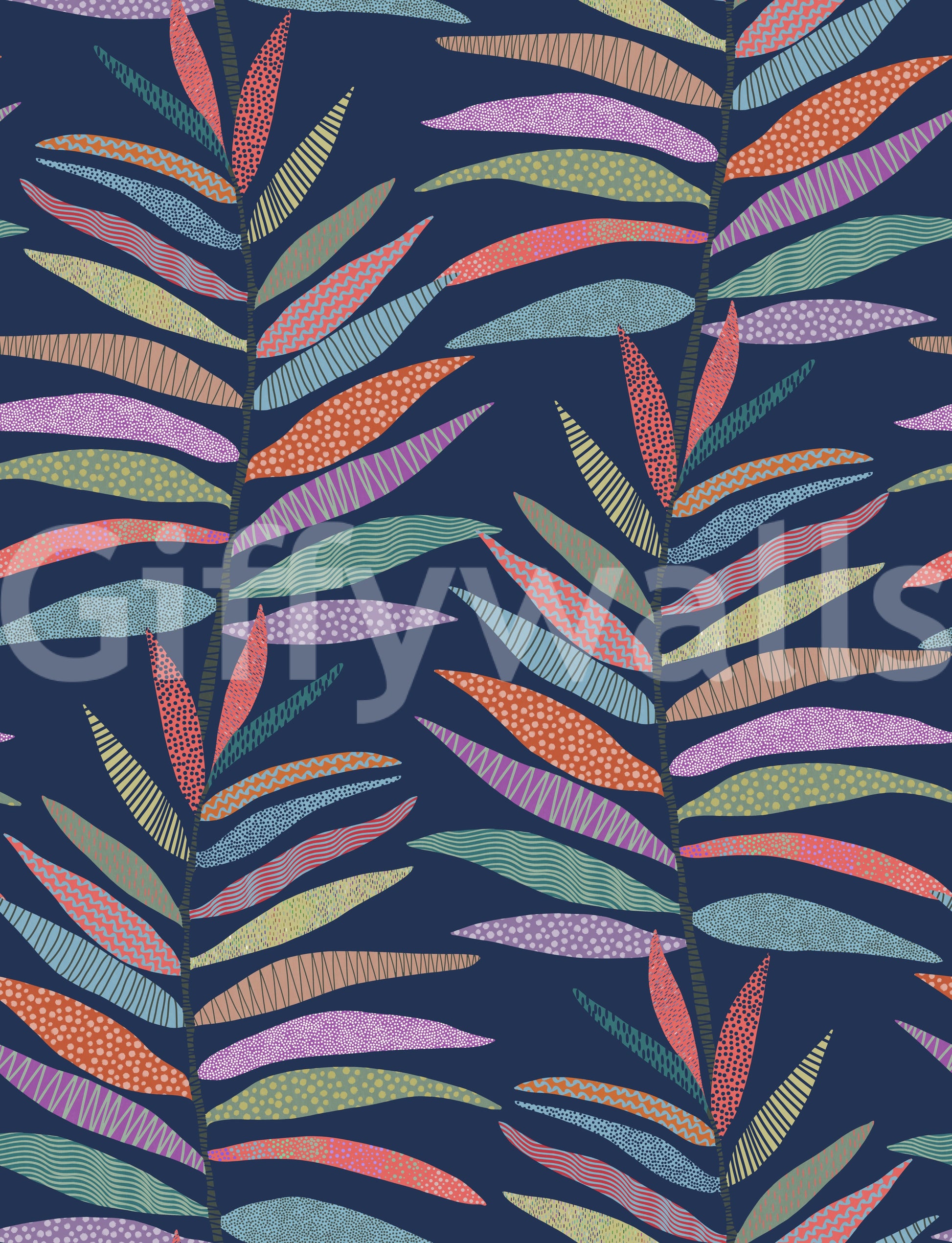 Verleihen Sie Ihren Wänden mit dieser gemusterten Tapete einen lebendigen, strukturierten Charme. Der tiefblaue Grundton lässt die verspielten, bunten Blätter besonders gut zur Geltung kommen. Jedes Blatt präsentiert ein anderes Muster – Streifen, Punkte und Zickzacklinien – und sorgt so für einen charmanten Akzent. Das Design harmoniert sowohl mit modernen als auch mit Retro-Einrichtungen. Ob Wohnzimmer, Schlafzimmer oder Flur – diese Tapete verleiht Ihren Räumen eine künstlerische Note. Das nahtlose Design schafft eine harmonische Gesamtwirkung und bereichert jedes Interieur mit seinem fröhlichen, botanischen Charme.