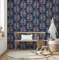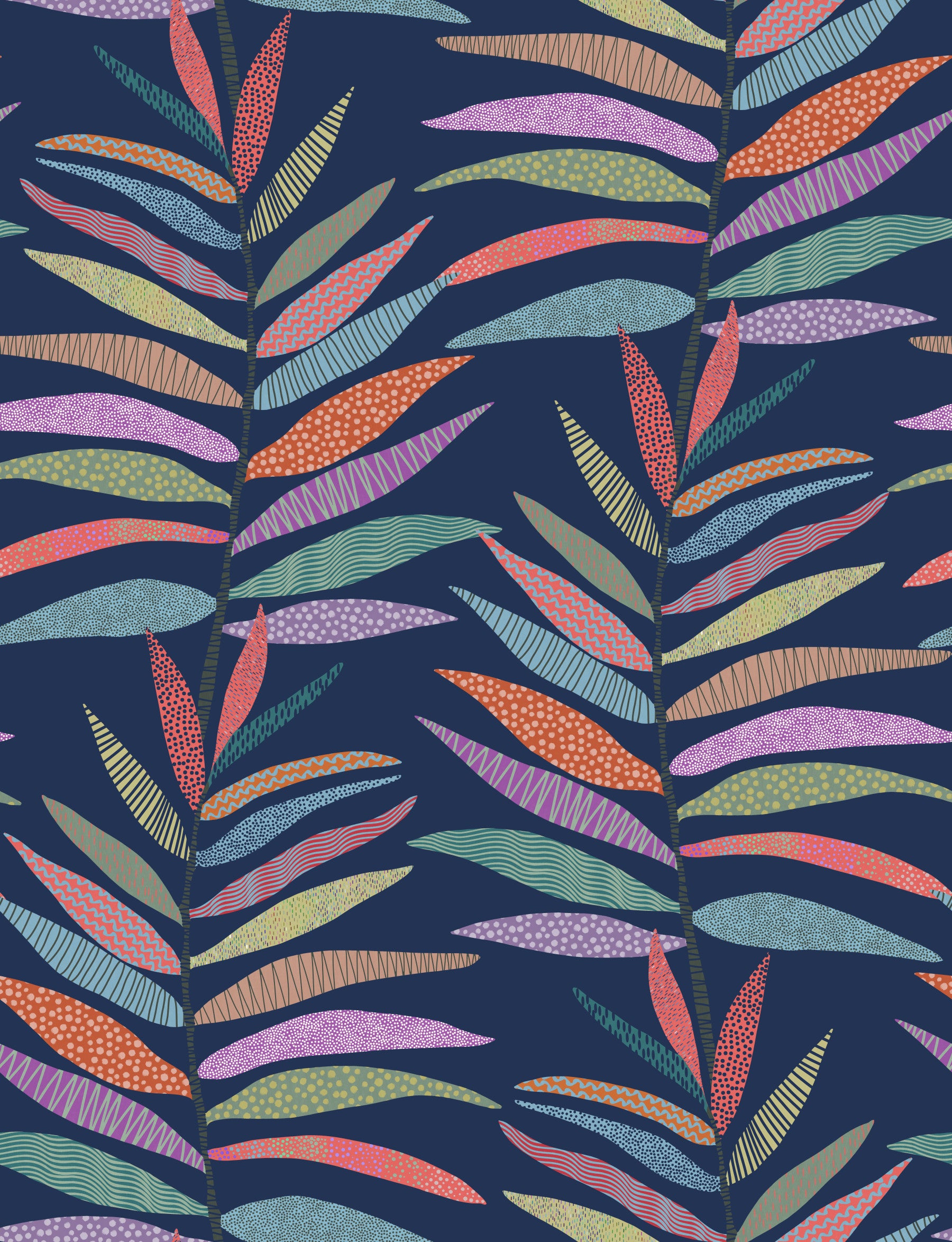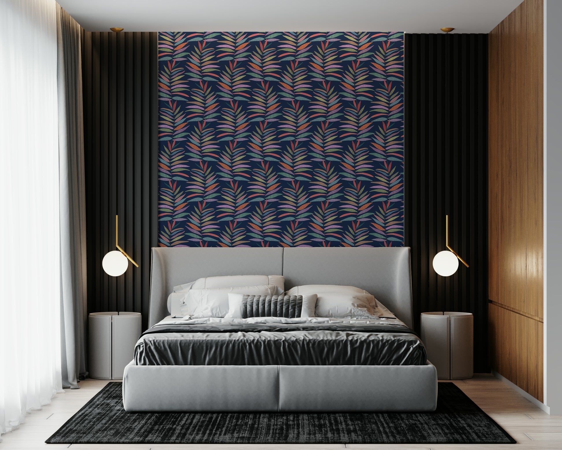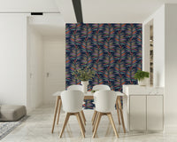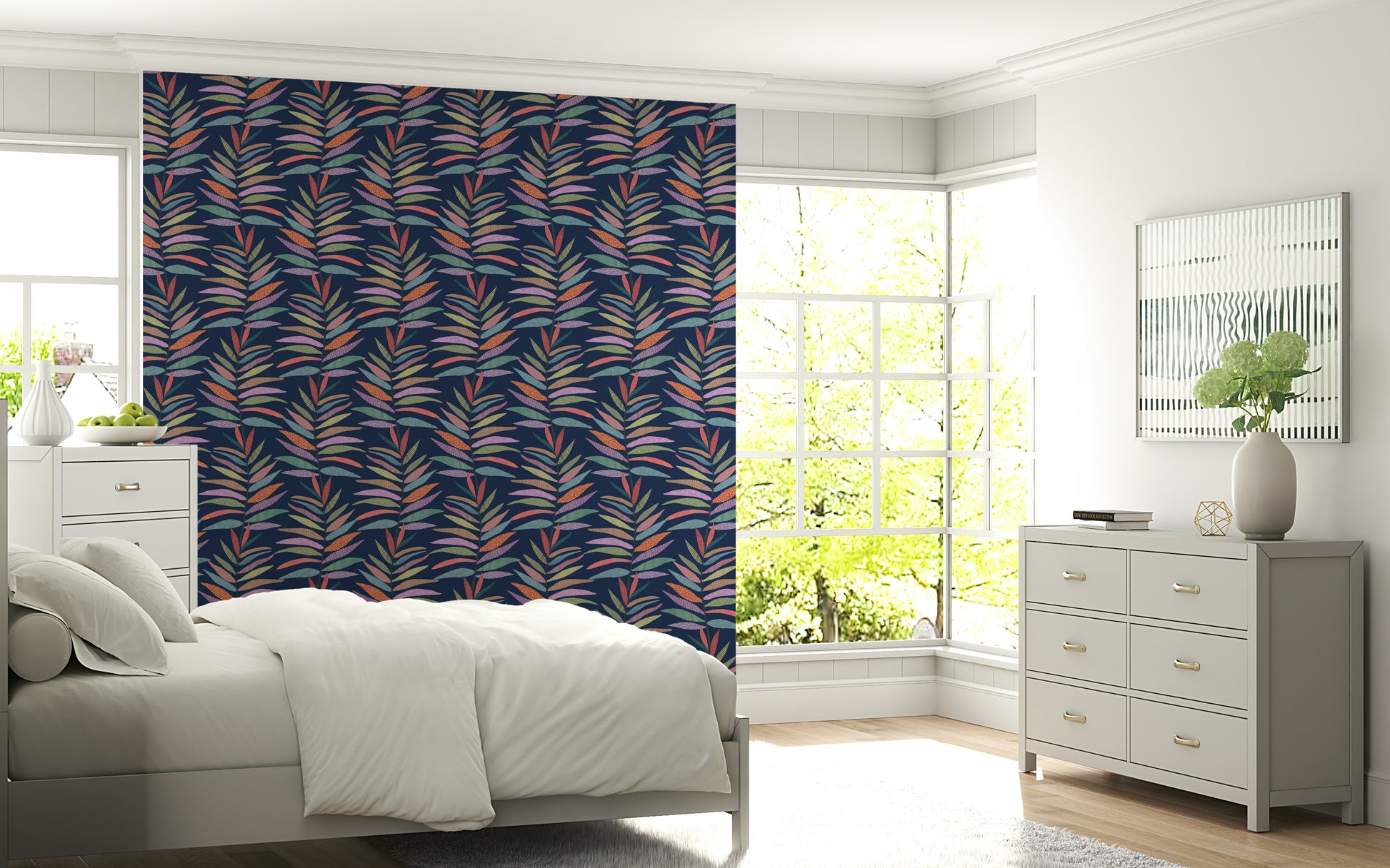 Verleihen Sie Ihren Wänden mit dieser gemusterten Tapete einen lebendigen, strukturierten Charme. Der tiefblaue Grundton lässt die verspielten, bunten Blätter besonders gut zur Geltung kommen. Jedes Blatt präsentiert ein anderes Muster – Streifen, Punkte und Zickzacklinien – und sorgt so für einen charmanten Akzent. Das Design harmoniert sowohl mit modernen als auch mit Retro-Einrichtungen. Ob Wohnzimmer, Schlafzimmer oder Flur – diese Tapete verleiht Ihren Räumen eine künstlerische Note. Das nahtlose Design schafft eine harmonische Gesamtwirkung und bereichert jedes Interieur mit seinem fröhlichen, botanischen Charme.