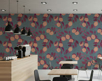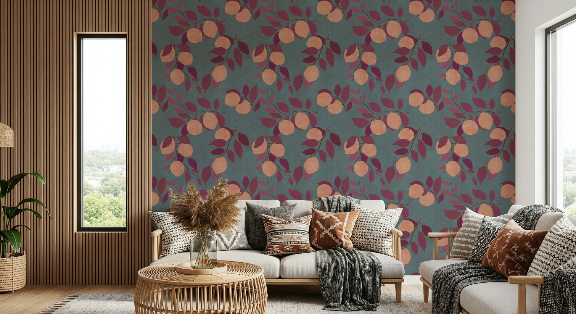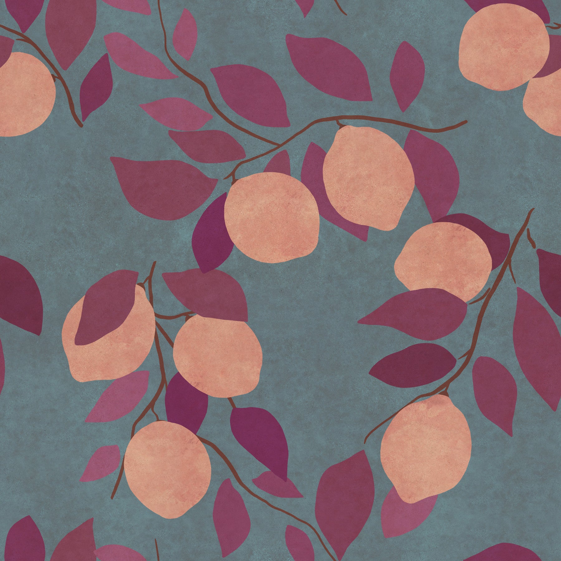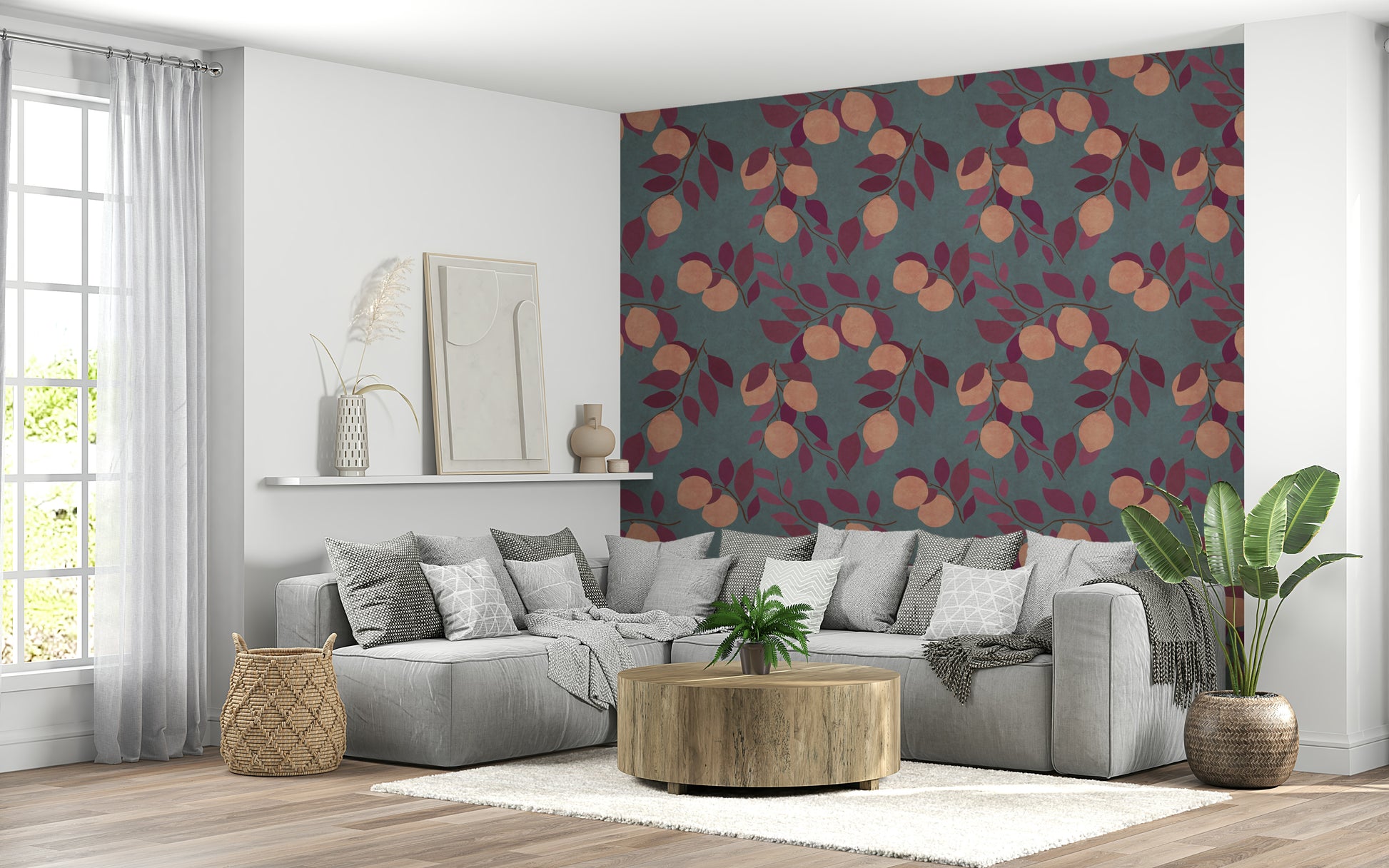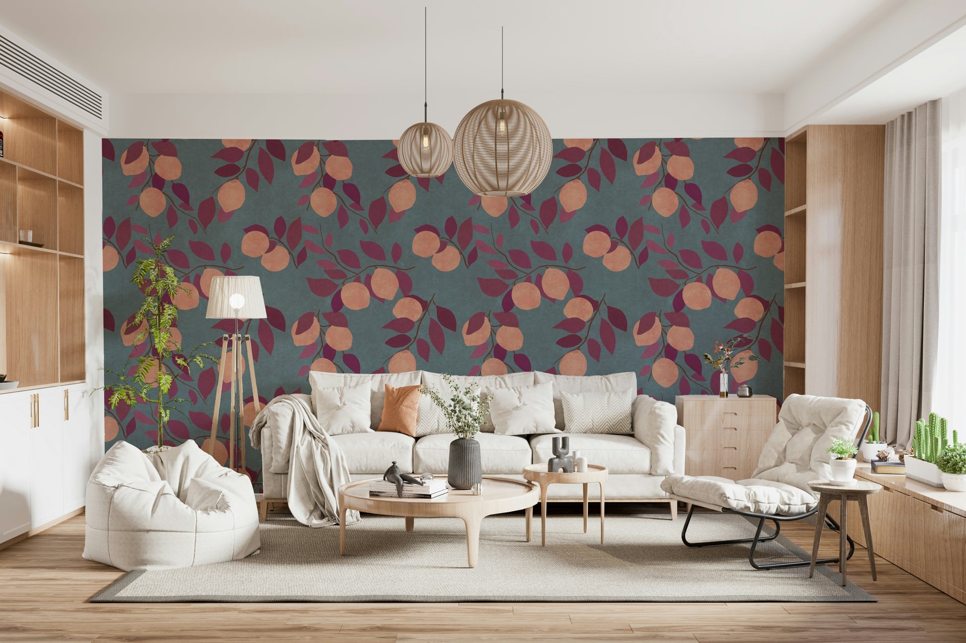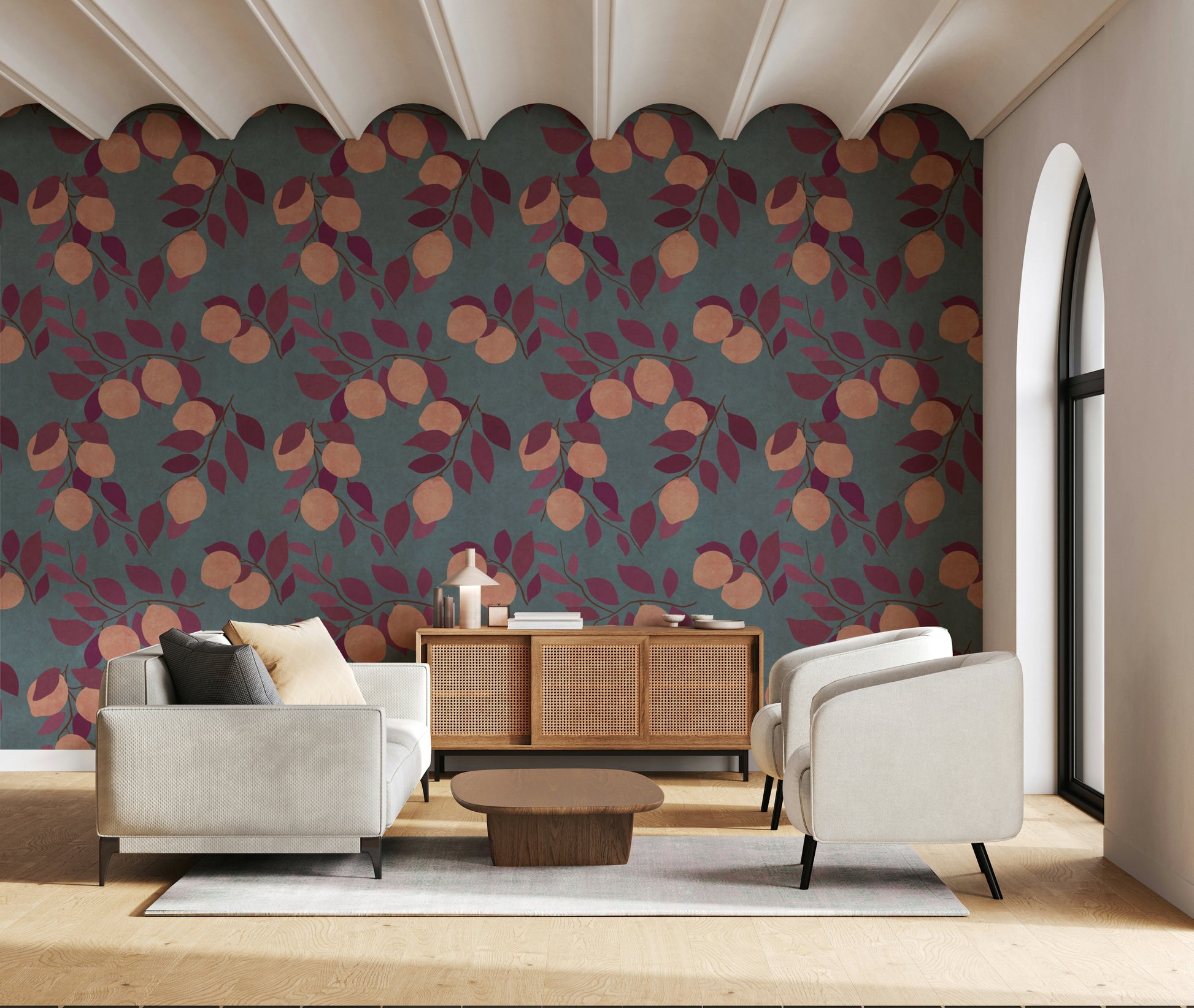 Verwandeln Sie Ihre Wände mit „Citrus Bliss“ in einen idyllischen Obstgarten. Diese atemberaubende Tapete besticht durch ein bezauberndes Muster stilisierter Zitrusfrüchte, eingebettet in leuchtendes, pflaumenfarbenes Laub vor einem dezent strukturierten Hintergrund. Die sanften Pfirsichtöne der Früchte erinnern an das warme Leuchten eines sonnenverwöhnten Hains, während die satten Blätter einen Hauch von Eleganz und Dramatik verleihen. Die harmonische Farbmischung schafft ein einladendes Ambiente, ideal für jeden Raum, der eine erfrischende und belebende Neugestaltung wünscht. Lassen Sie die schlichte Schönheit der Natur Ihr Zuhause mit einer beruhigenden und zugleich fröhlichen Atmosphäre erfüllen. Dieses Design interpretiert klassische botanische Motive modern und ist somit eine zeitlose Bereicherung für Ihre Inneneinrichtung. Holen Sie sich mit „Citrus Bliss“ die Essenz eines blühenden Zitrusgartens ins Haus.