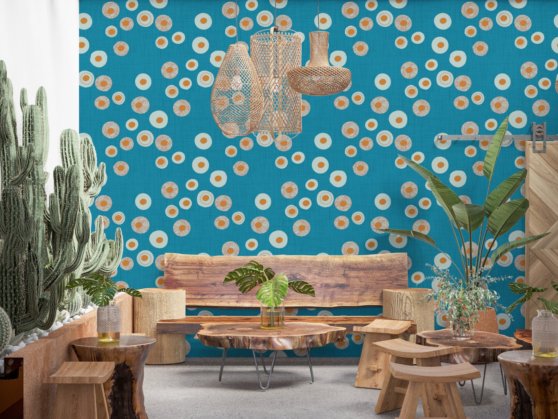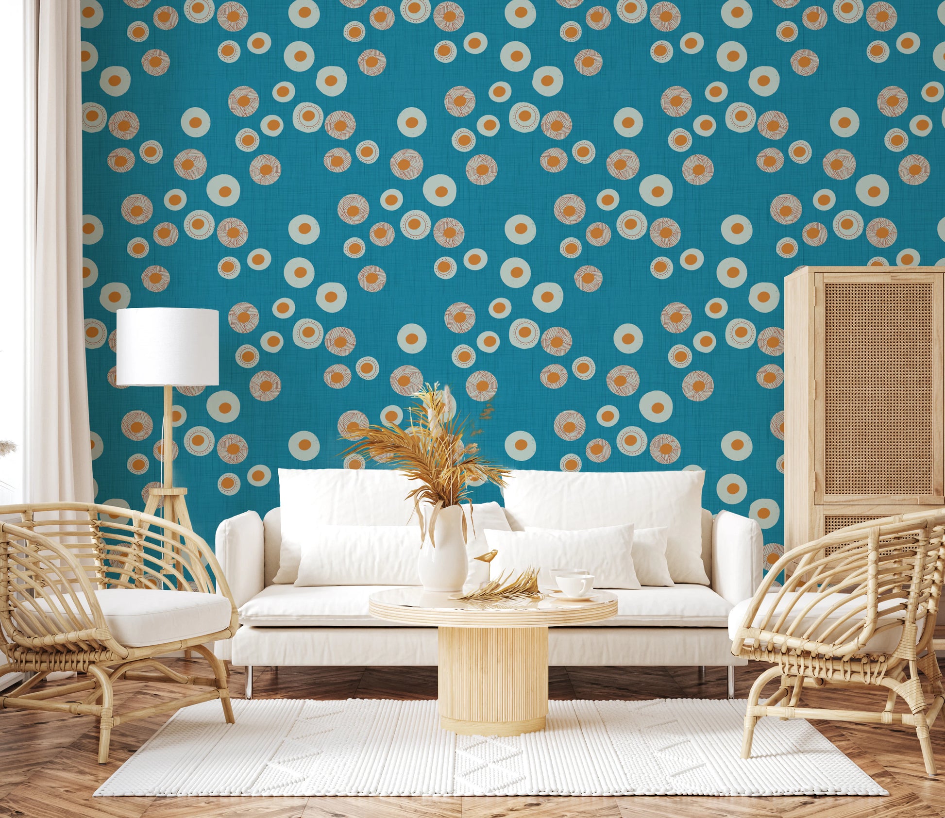 Verwandeln Sie Ihre Räume mit dem behaglichen Charme der Tapete „Cozy Scandi Folk Dot Floral Nordic Teal – Craft Circle“. Dieses bezaubernde Design bringt nordische Wärme in jeden Raum und besticht durch verspielte Kreise in einer Farbpalette aus sanftem Türkis, zartem Cremeweiß und warmem Ocker. Einige Kreise zieren handgezeichnete Linien, die von ihrem Zentrum ausgehen, während andere durch ihre schlichte, klare Ästhetik bestechen und so ein optisch ansprechendes Gleichgewicht schaffen. Die dezente Textur im Hintergrund verleiht der Tapete Tiefe und erinnert an handgewebte Stoffe. Diese Tapete ist ideal, um eine gemütliche und einladende Atmosphäre zu schaffen und verkörpert die Essenz skandinavischer Volkskunst – perfekt, um Ihrem Zuhause einen Hauch von verspielter Eleganz zu verleihen.