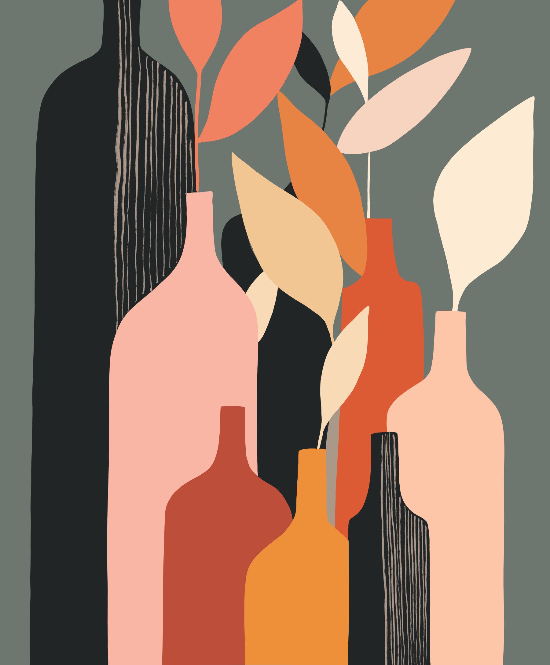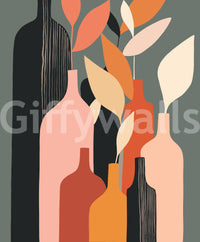 Tauchen Sie ein in die beruhigende Welt von „Earthy Hues Bottle Decor“, einem raffinierten Wandbild, das jedem Raum einen Hauch organischer Eleganz verleiht. Diese kunstvolle Komposition präsentiert stilisierte Flaschen und abstrakte botanische Elemente in einer warmen, einladenden Farbpalette aus Erdtönen. Terrakotta, gedecktes Orange, zartes Rosa und tiefes Anthrazit harmonieren mit einem beruhigenden graugrünen Hintergrund und schaffen eine visuell wohltuende und ausgewogene Ästhetik. Die schlichten, aber eleganten Formen der Flaschen bilden einen Kontrast zu den organischen Formen abstrakter Blätter und verleihen dem Bild Tiefe und visuelle Reize. Die subtilen Texturen und Variationen innerhalb der Farbflächen verleihen dem Kunstwerk einen handgefertigten Charakter und unterstreichen seinen einzigartigen Charme. Bringen Sie mit diesem außergewöhnlichen Stück, das perfekt für eine entspannende und stilvolle Atmosphäre geeignet ist, ein Gefühl von dezenter Eleganz und naturnaher Ruhe in Ihr Zuhause.