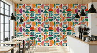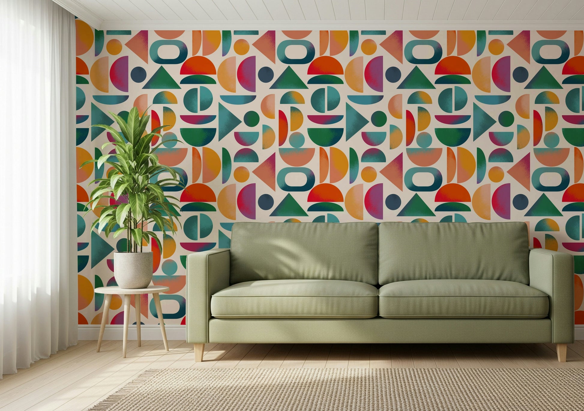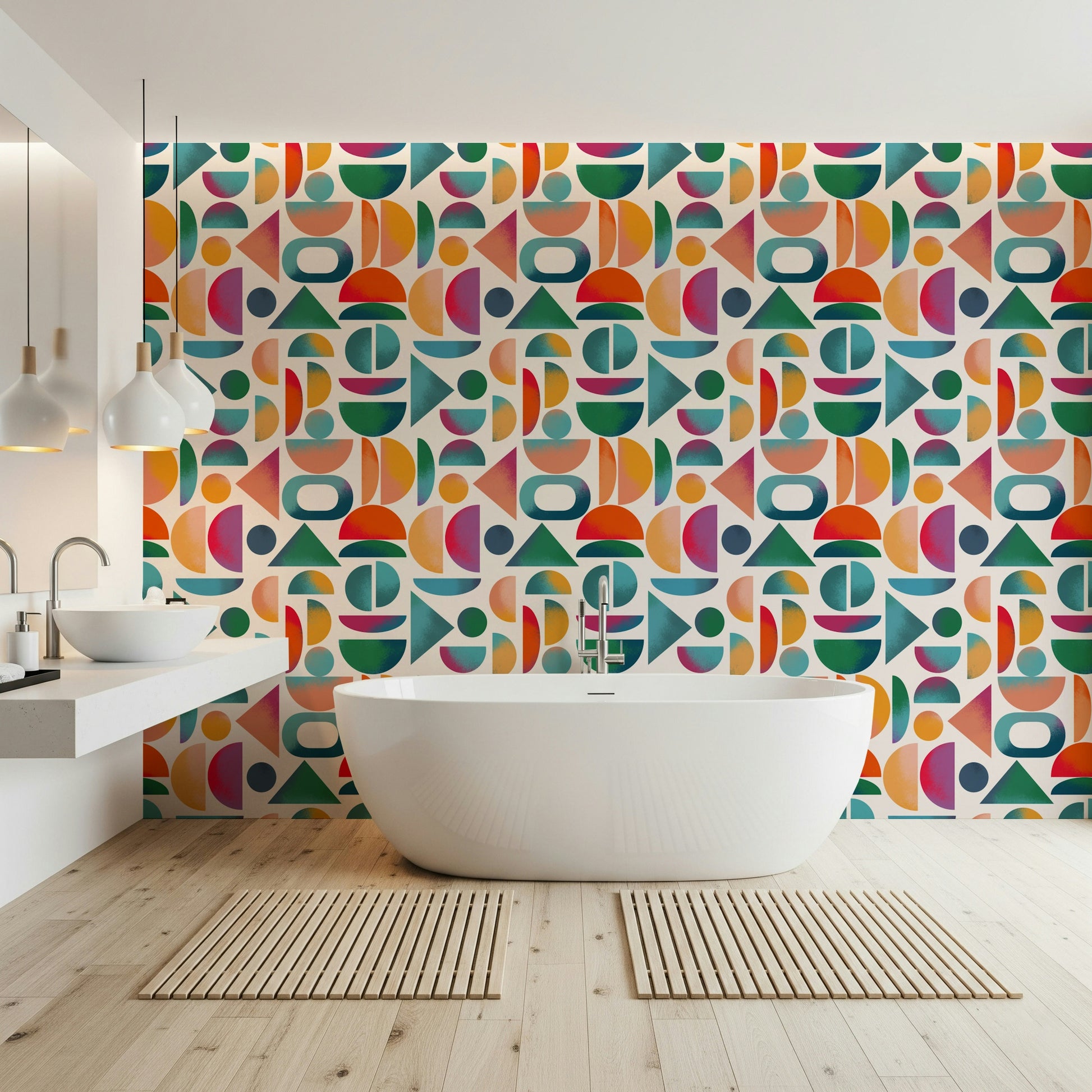 Verleihen Sie Ihren Wänden mit dieser ausdrucksstarken und ansprechenden Tapete einen Hauch von Vintage-Stil. Das Design besticht durch Kreise, Halbkreise und Dreiecke in leuchtenden, lebendigen Farben. Koralle, Türkis, Orange, Rosa und Grün harmonieren perfekt miteinander und erzeugen eine warme und lebendige Atmosphäre. Diese markante Tapete eignet sich für Esszimmer, Küchen oder Flure und bringt Retro-Flair in jeden Raum. Die geometrischen Formen sorgen für Struktur und Ausgewogenheit, während die strukturierte Oberfläche für optische Akzente sorgt. Schaffen Sie mit diesem dynamischen Design einen Raum, der modern und einladend zugleich ist.